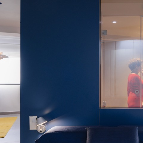 Instead of the idea of separated rooms and corridors, as it was in the original house, this small and individual pied à terre is projected and organized as a single room where the entire domestic program, no matter public or private, is connected by a gray porcelain floor. The most emblematic feature of this house is a chest-cabinet lacquered in a blue RAL 5005 that adapts like a glove to the space and is located in the heart of the house; it contains and brings together the storage of the house and hides inside a secret room: the bathroom. This space for the care and maintenance of the body is naturally illuminated and visually connected to the bedroom through a large interior window that changes its opacity according to the privacy needed at different moments.