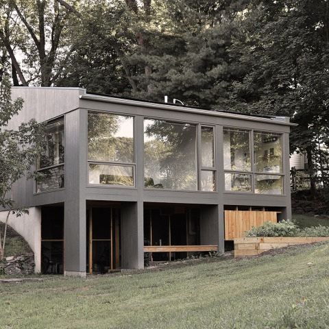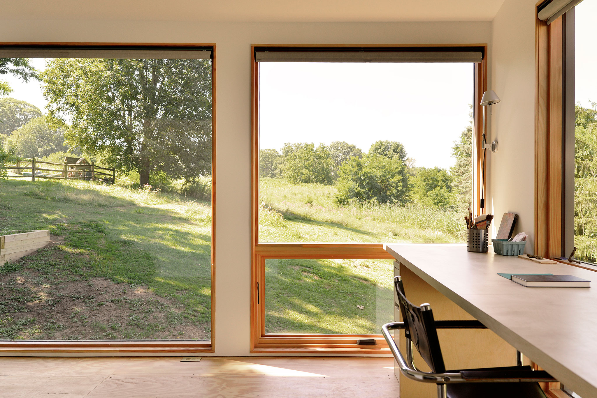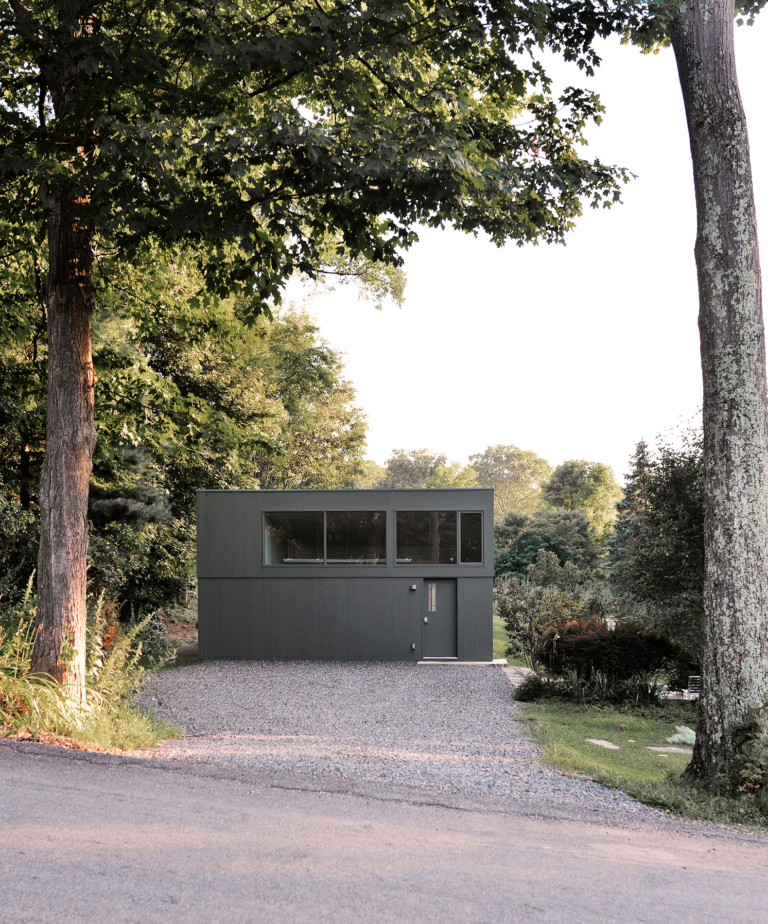 The studio floor is a continuation of the exterior courtyard, so as the ground drops away, the interior space of the studio begins to float within the landscape, overlooking a dramatically sloped backyard, neighboring fields, and the Hudson River beyond.