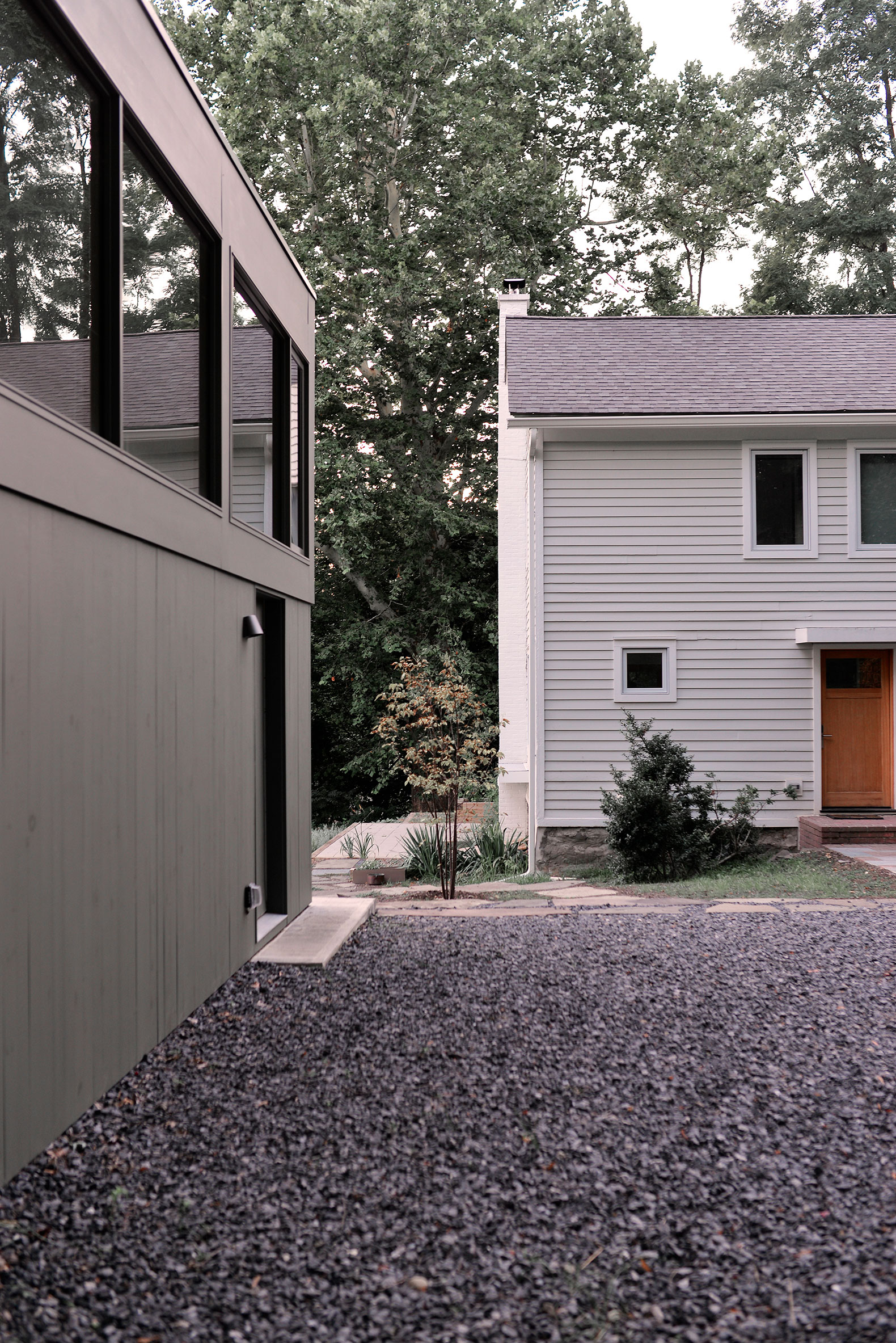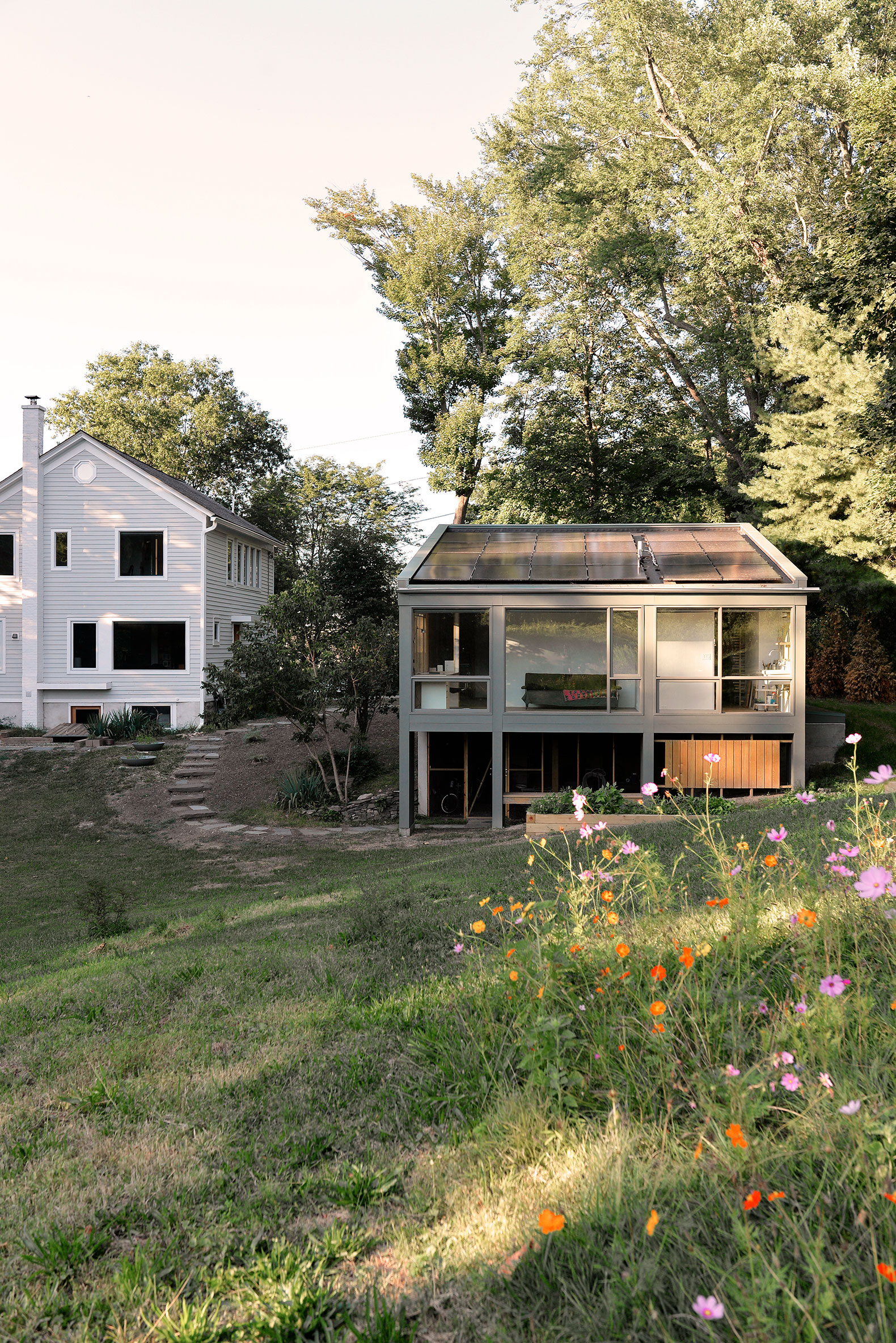 The Studio is positioned on a steep slope next to a recently renovated 1800s farmhouse, creating an entry courtyard for both buildings framed by mature trees. Its roofline follows the natural slope of the topography as it drops away, concealing the building mass from the direction of neighboring properties, while creating an ideal space for solar panels on its south-facing facade.