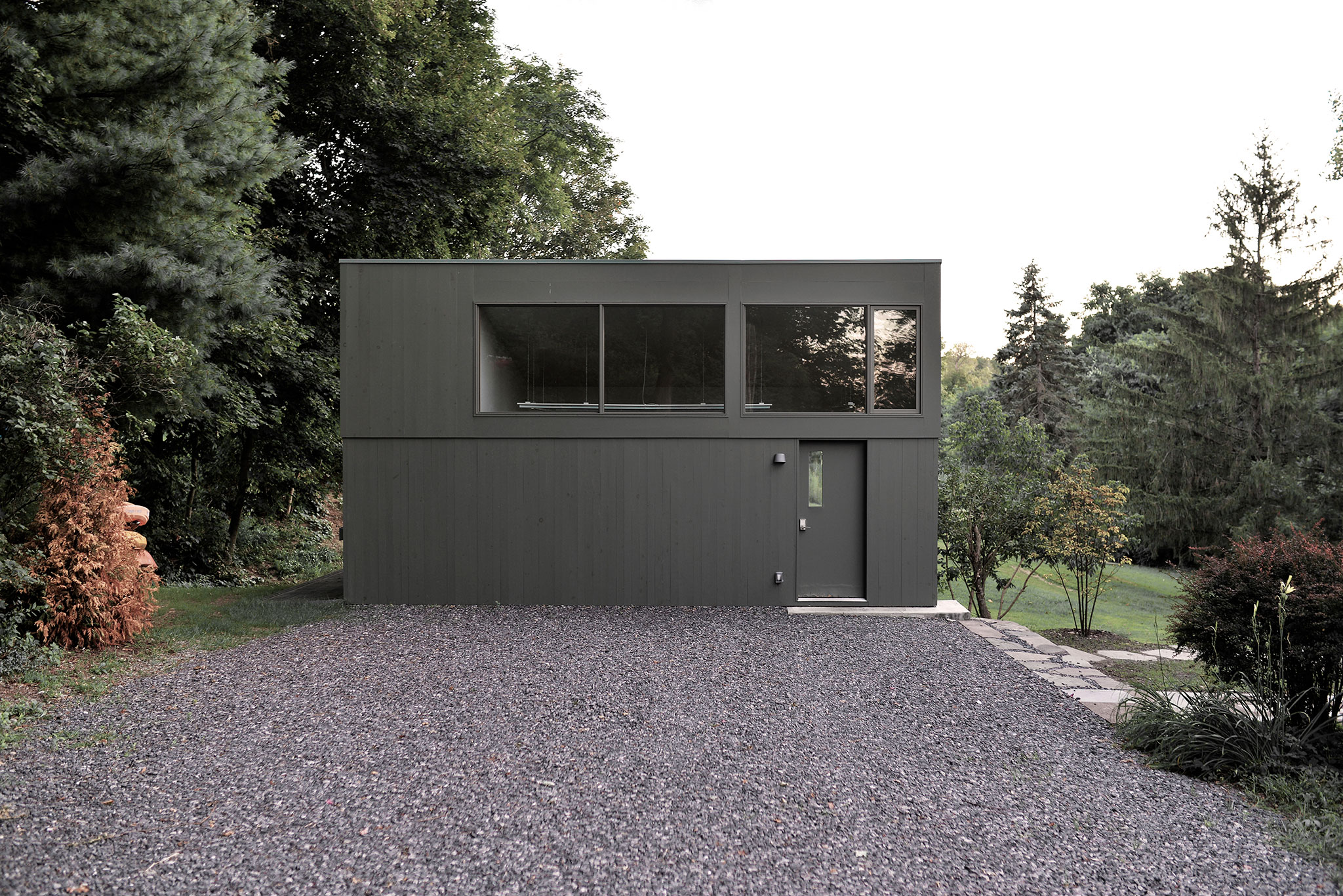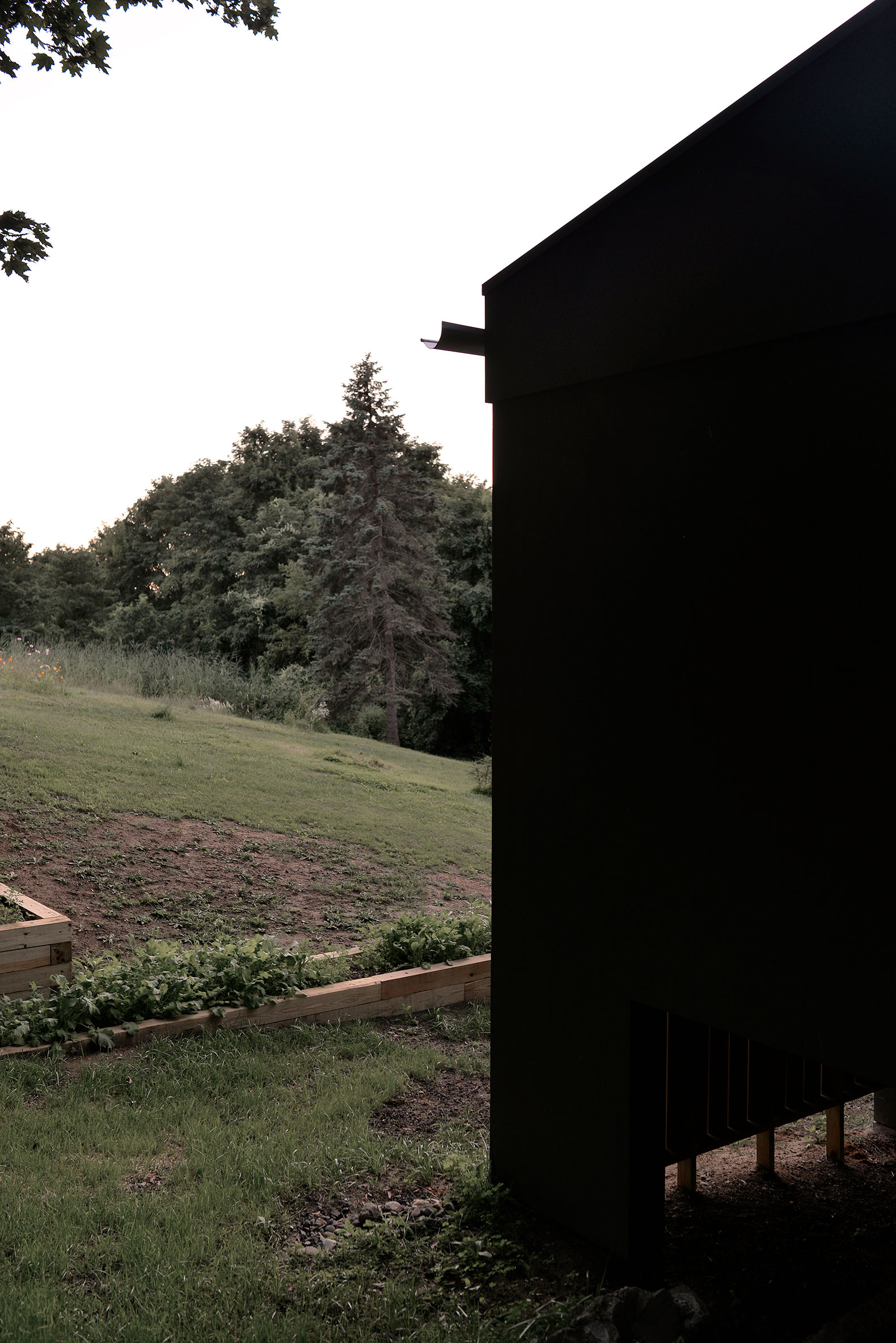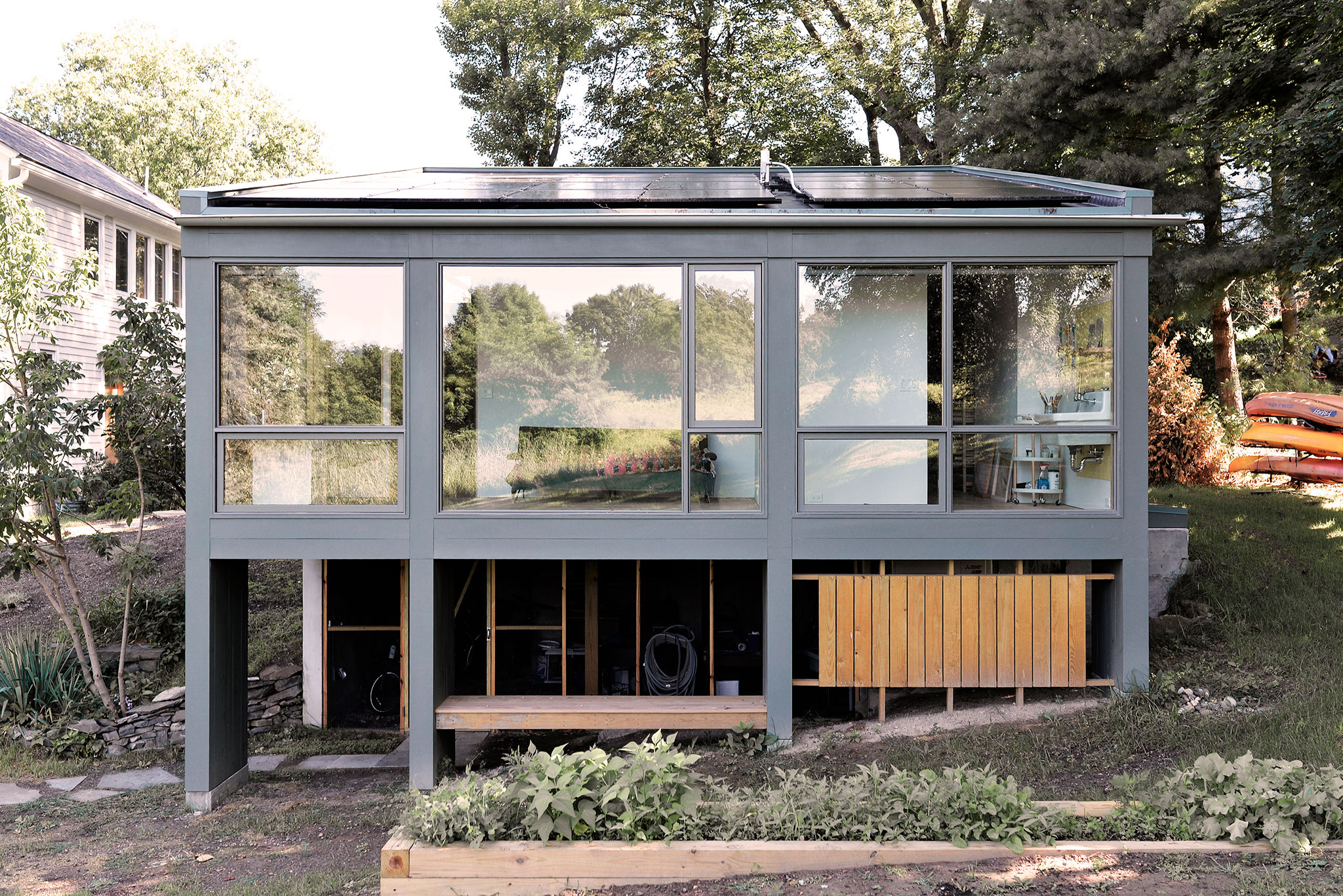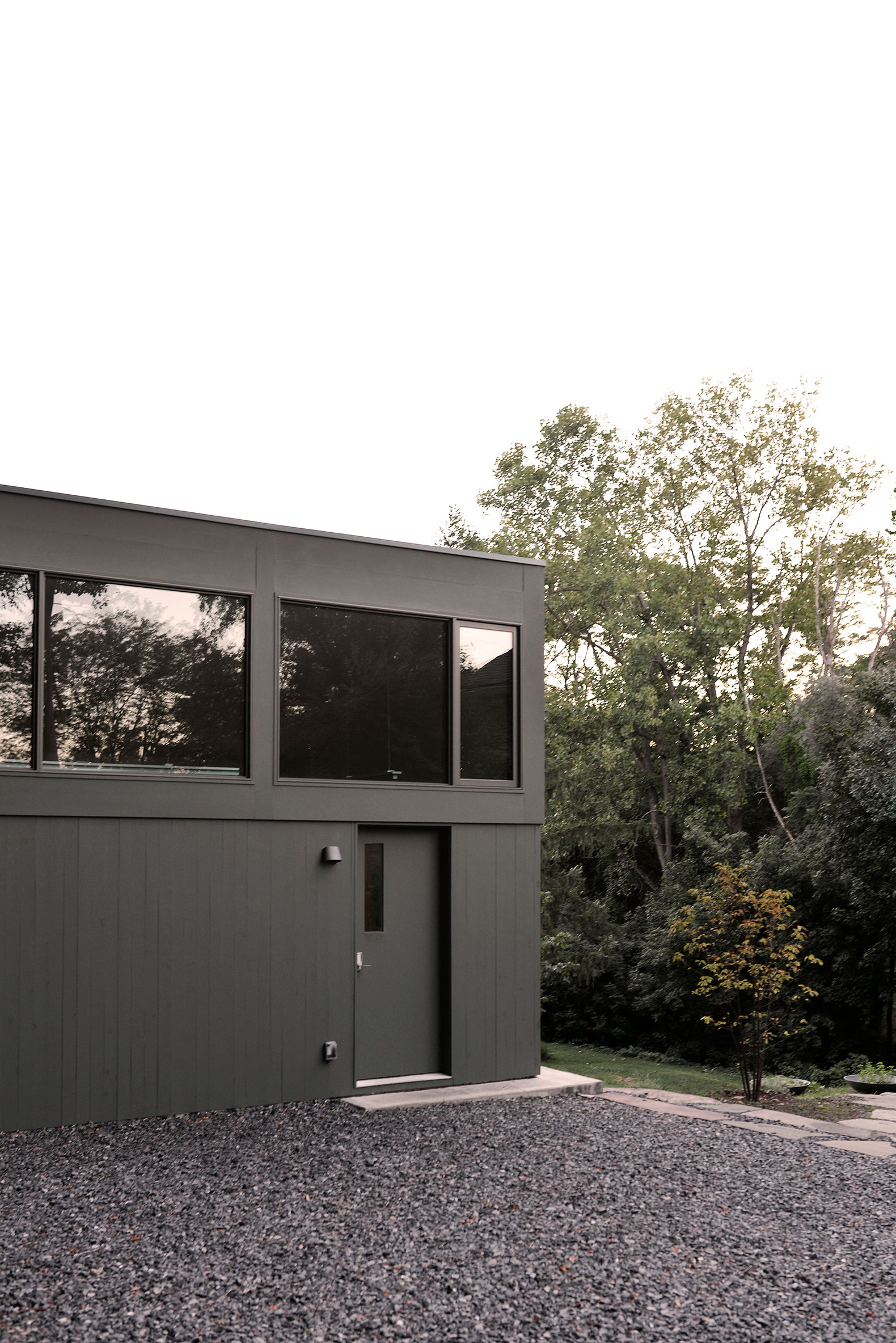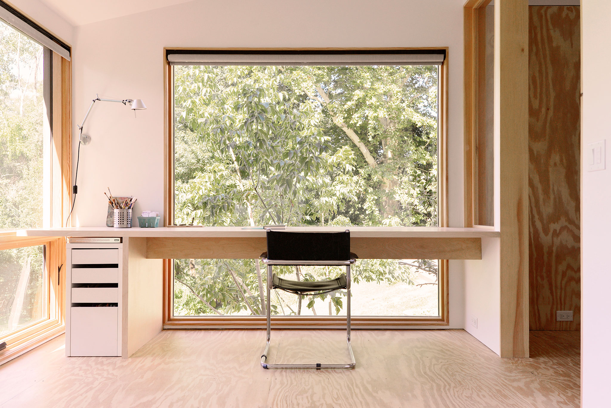 Ballman Khapalova designed the house on a hillside, on the foundation of a dilapidated garage built in 1950, reusing existing elements as much as possible, such as a cistern for utilities and a partition for tools. The floor is made entirely of CDX plywood, which also covers the studio walls to ensure durability, flexibility, and a restrained appearance.