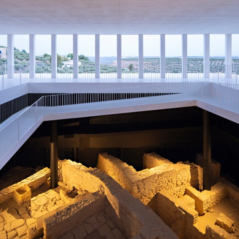 The new building is located on a hillside on the urban edge of Porcuna, facing a sea of olive groves. The space houses, as the main protagonist of descent and ascent, from the exterior light to the darkness, the cistern, a suspended walkway that facilitates "a journey through the centuries that culminates in the peristyle that welcomed it."