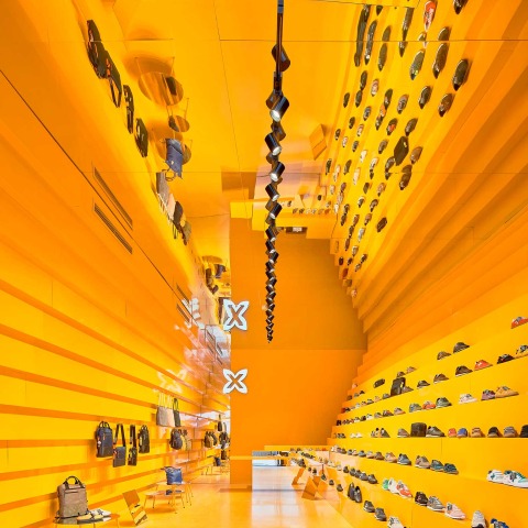 The roof and floor of the store are two fundamental elements in this operation. Both reinforce this exercise in geometry. The ceiling is a large mirror surface that reflects the entire interior space, building the illusion of its continuation and generating the perception of a very slim interior space. The reproduction remains in the visitor's unconscious thanks to this reflection of the brand's logo, the X, which to some extent caused this work with oblique geometries and diagonal spaces.