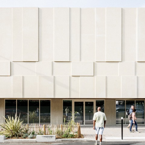 By opening up to its surroundings on all four sides, the covered forecourt, set back from the street, structures the public space and provides access to the facility. Taking advantage of the special features of the adjacent Parc Stalingrad, the landscaping creates views between the interior of the gymnasium and the petanque courts. To the south, the visual porosity highlights the spectacle of sport, with the north facade providing a ‘backdrop’ along the pedestrian walkway. The structure is a raised, stone-tone mineral monolith, with the glazed strip on which it rests giving it an airy appearance. The sports hall offers spectators a bird's-eye view of the action on the pitch.