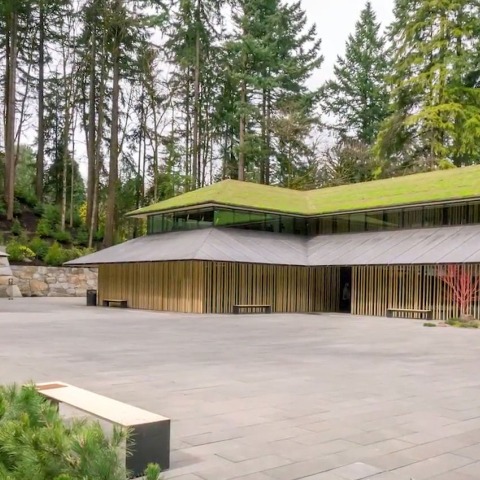 There are four buildings, each with its own means of merging into the dramatic slopes of the terrain, in combination with the tall vertical lines of the Pacific Northwest conifers: the Ticketing Pavilion floating above gentle stepped ponds, the Tea Cafe hovering above the ravine, and the main Village House and Garden House.