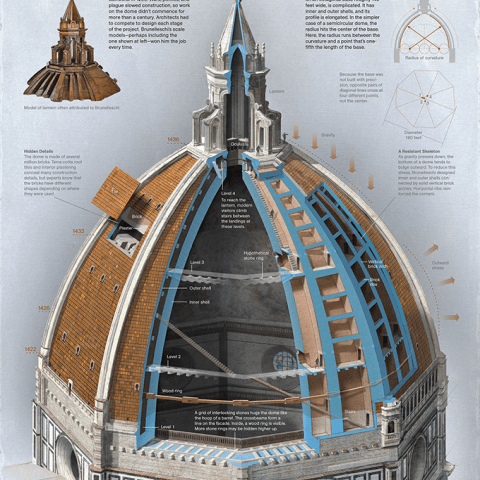 In 1418 the town fathers of Florence finally addressed a monumental problem they’d been ignoring for decades: the enormous hole in the roof of their cathedral. Filippo Brunelleschi was tasked with building the largest dome ever seen at the time. He had no formal architecture training. Yet experts still don't fully understand the brilliant methods he used in contructing the dome, which tops the Santa Maria del Fiore cathedral in Florence, Italy. This short animation, presented by National Geographic and created by Fernando Baptista and Matthew Twombly, gives an idea of how the dome of the Duomo might have been built. Demonstrating the complexity of the task, made harder due to poor construction prior to Brunelleschi’s commission, this film serves as a reminder of just how long it can take to create something timeless.