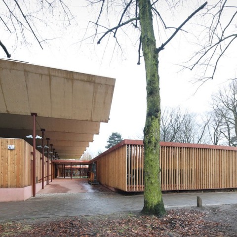 The sharp contrast between the two users is softened by raising the level of the kindergarten, thus putting all users at eye level, only separated by a glass wall. Seen from the outside, the raised level detaches the building from the park, allowing the greenery to flow freely around it.