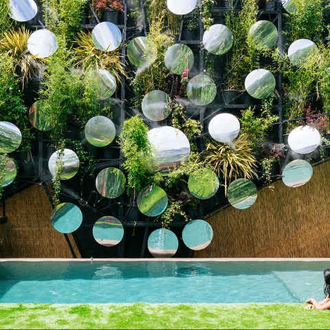 Manuel Ocaña was commissioned to design SPLASH, a vertical element capable of restoring the life of a garden that had been threatened by a large wall built on the adjacent plot. SPLASH not only covers the gloomy dividing wall but also also projects clouds of water to acclimatize and reacts to light, reflecting it.