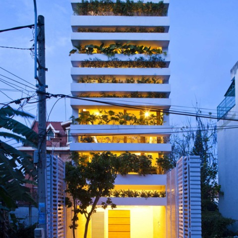 The house, designed for a thirty-years-old couple and their mother, is a typical tube house constructed on the plot 4m wide and 20m deep. The front and back façades are entirely composed of layers of concrete planters cantilevered from two side walls.
