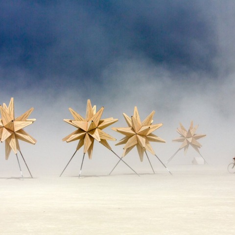 Starlight - was a modest sculptural lighting installation. Seven twelve foot diameter icosahedron plywood stars were placed to map out the constellation Orion creating a "heaven on earth" effect. Stars were installed throughout 2012 at Burning Man, Critical Massive, Summer Meltdown, Deep Playa Equinox and Seacompression.