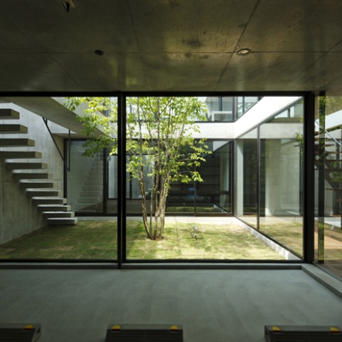 The client acquired the 330 m² orthogonal property located along the road in pursuit of a space to rest his body and soul exhausted from his work as a surgeon. He requested privacy and quietness for his wife and three children to lead healthy lives. The building is set back from the frontal street where heavy vehicles pass by regularly. Parking space is secured for three cars. Reinforced concrete structure is chosen for its soundproofing ability. The opening is kept to a small horizontal ribbon window to block the noise and automobile emissions.