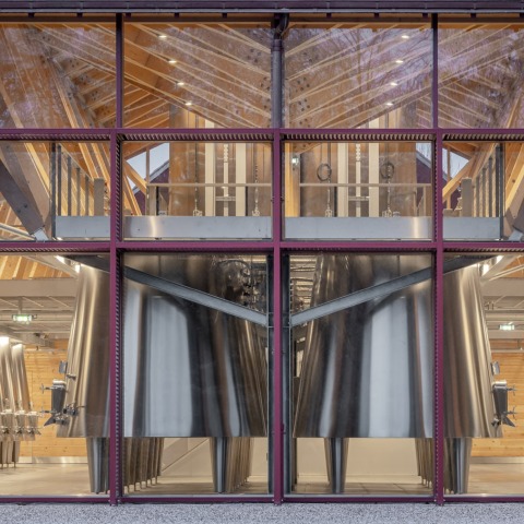 A wine harvest hall houses the work and welcomes visitors under a massive moulded wooden frame, painted red (flour paint). A vaulted port-cochere opens onto the vat-hall, a vast two-level space dedicated to an entirely gravity flow vinification process. Natural light is present across the entire depth of the space thanks to a careful design of folds and edges of the roof, accessible by running along the rammed earth wall, and the shaded place where the wine is slowly aged in wooden barrels. The high vault made of solid moulded wood rests on steel compasses.