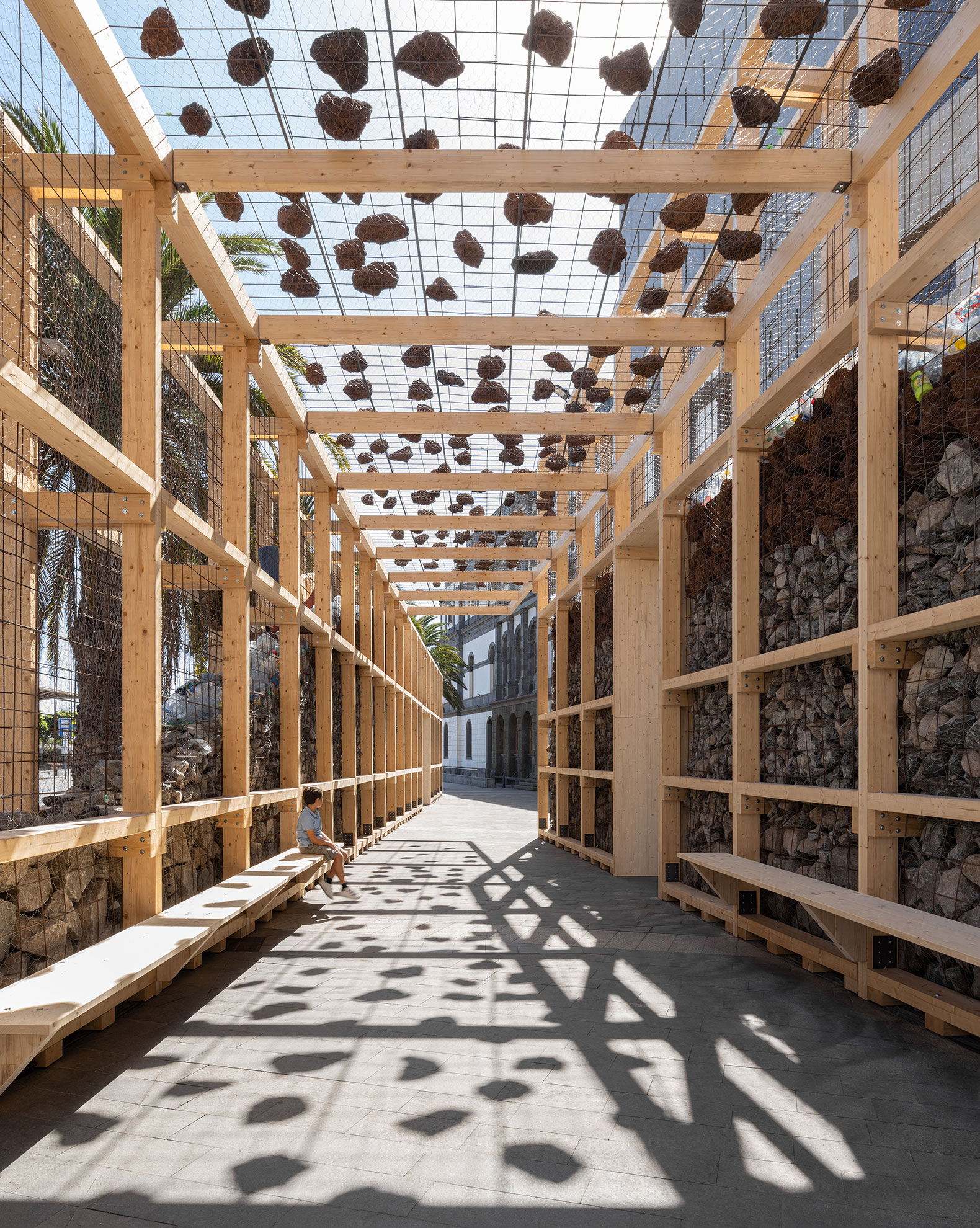 The "De Roca Madre" pavilion, created by Alejandro Carrasco Hidalgo, Eduardo Cilleruelo Terán, Alberto Martínez García, and Andrea Molina Cuadro (Estudio Latente), is the second pavilion at the second venue of this edition of TAC!, which began with the presentation of "ESPARTAL" in Alicante. This temporary installation aims to transform the Plaza de Stagno into a vibrant, educational, and symbolic space, using the volcanic rocks that characterize the region as a reference point, juxtaposed with the plastic waste found on the island's beaches.