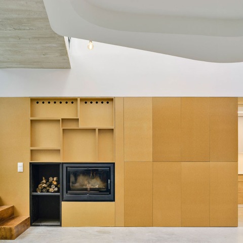 The materiality of the interiors is basic: all the floors are made of concrete with polyurethane resin and incrustations of larch trunk slices in some places. The walls are made of white plasterboard, shaded by the curves and the incidence of light on them. This part contrasts with the exposed concrete of the connecting bridge between rooms and the separation wall between strips that is defined by lacquered DM and transparent glass. The materials in the façade are constrained by local regulations: stuccos and ceramics. It reflects the three levels of the house with different stuccoes separated by the known hexagonal ceramic tiles designed by Antonio Gaudí.