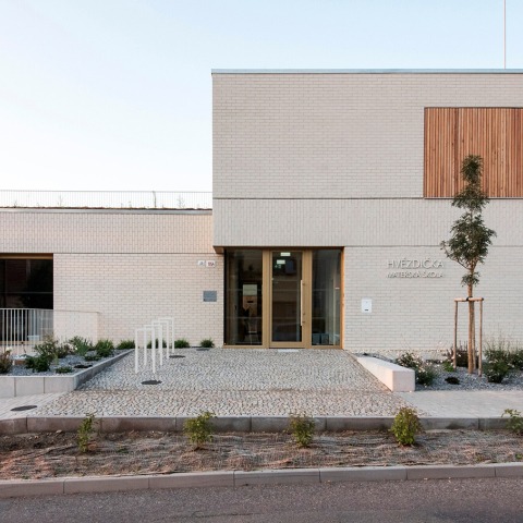 Finding a good site for a kindergarten in the city is not easy; however, the site of a former neighborhood store, where the Hvězdička Kindergarten is located, adequately meets the needs of the program. The new monolithic and compact volume fits subtly between the neighboring houses, generating attractive and welcoming interior spaces for children.