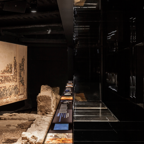 Through dark tunneled stairs, the visitor arrives to a longitudinal platform, a sort of balcony raised above the Domus remains.The space disappears, painted in black. Only emerge the archaeological remains and a large mural painting that originally was on the ceiling of one of the Domus rooms.