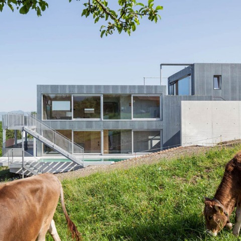 Environmental sustainability and the possibility of a reuse of materials was a main aspect from the beginning of the project. All surfaces were left untreated, and natural materials were used for insulation purposes. The solid wooden walls consist of industrial-grade spruce, which was chosen for its warm quality and lack of perfection. It is opposed by metal elements whose galvanized surfaces create a velvety impression, and cores of exposed concrete displaying a high quality of workmanship. This change of materials deliberately creates tension, which, however, should not lead to a fear of contact: the act of living may leave its marks.