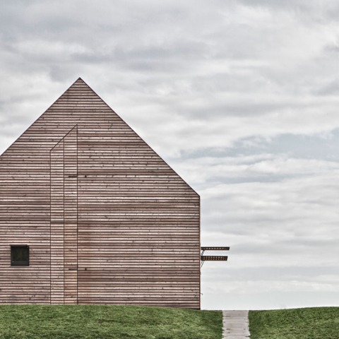 As the summer house is not inhabited during the winter months, a larch grid mantle was developed which can be shut completely. During the uninhabited winter months, the house is thus unobtrusively and sculpturally situated in the landscape. In order to achieve this, folding and flap shutters were developed which, when shut, flush with the façade and, also coated with rhombus boarding, melt into the mantle. In the summer, the shutters work against aestival overheating: when opened – as canopies – and when shut. The sharp edges of the cubature are formed by copper corner plates.