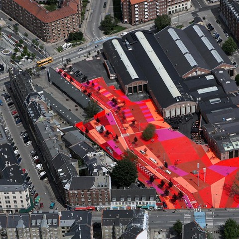 Superkilen is a 30,000 m² urban space that cuts through one of the most ethnically diverse and socially challenged neighbourho sods in Denmark. The project possesses all that typically makes up a modern park with trails for pedestrians and cyclists, connections to local transport and outdoor recreation spaces along with a market space and games areas. Superkilen is a park reflecting diversity. The project is intended to celebrate the neighbourhood’s multi-cultural heritage and unite everybody in one global neighbourhood. Rather than plastering the urban area with traditional Danish design the team decided to gather the local intelligence to create a display of global urban best practice when it comes to urban furniture. The project is conceived as a giant exhibition of urban best practice - a collection of global objects from the 62 home countries of the local inhabitants. These objects range from exercise gear from Muscle Beach in LA to sewage drains from Israel, palm trees from China and neon signs from Qatar and Russia. Each object is accompanied by a small stainless plate inlaid in the ground describing the object.