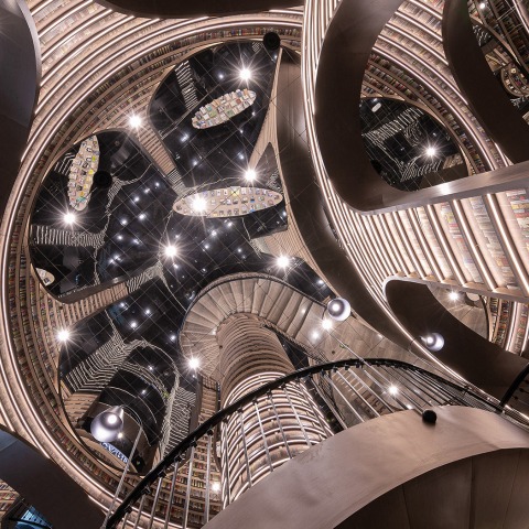 Described by the lead of Chinese architecture firm, Li Xiang, as a "paradise for bookworms", the space makes intelligent use of contrast to heighten the experience of emerging into the vast main hall, where the curved bookshelves preceding it induce a sense baroque of end-less space.