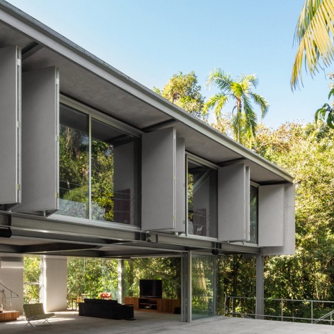 The Guarujá House, located in the city of Guarujá on the coast of São Paulo, sits within a gated community that is part of a protected area of the original Atlantic Forest. To preserve the richness of this native forest, local regulations permit only 30% of the land area to be developed. The challenge was to accommodate a program that required at least 450 m² of built space. To achieve this, the design was divided into three levels.