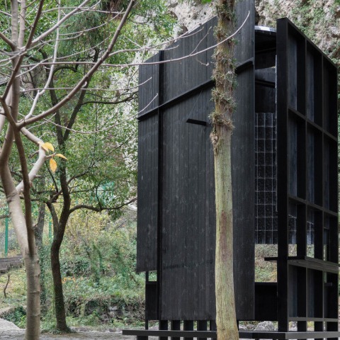 The architectural studio aptdotapt transforms, based on the waterfalls of Yandang Mountain, which fall from imposing heights, the traditional roofs that protect architecture from wind and rain into a pavilion composed of elements that collect water to welcome it inside, creating a sensitive material contrast that, together with the carbonized wood that makes up the main structure and with upper eggs, filters the sun and creates a delicate play of light, shadow and reflection.