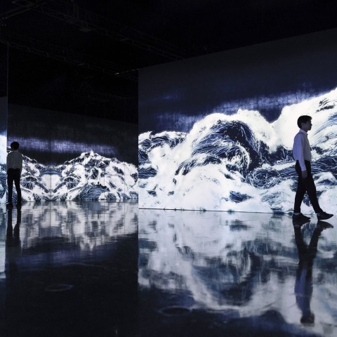 After calculating the interaction of thousands of particles with each other, a computer-generated 3D space expresses its movement in a large mass of water that gives rise to a continuous wave. The resulting space generates an attraction in the viewer who feels immersed in the force of the waves and is part of a whole in the same way as these particles do. It incorporates more than thirty projections in an area of reflective walls and floors generating a powerful immersive effect where the visual recreation of water, as a key element of the natural environment and life, plays a leading role.