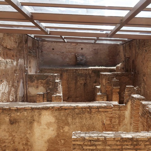 The intervention offers a temporary roof solution to protect the structures of the Baño de la Alcazaba of the Alhambra in Granada, a unique building that functioned as a hammam in the Andalusian period. After its use was prohibited in the 16th century, it was partially demolished and remained buried until the beginning of the 20th century, when the structures visible today were exhumed. It is made up of brick masonry walls and calicostrated earth walls two meters high with remains of original plaster coverings, recognizing the functional program of three correlative rooms at different temperatures: cold, warm, and hot. It preserves the hypocaust, a raised pavement, with which the hot room was heated, as well as the boiler system, chimneys, water tanks, and latrine.