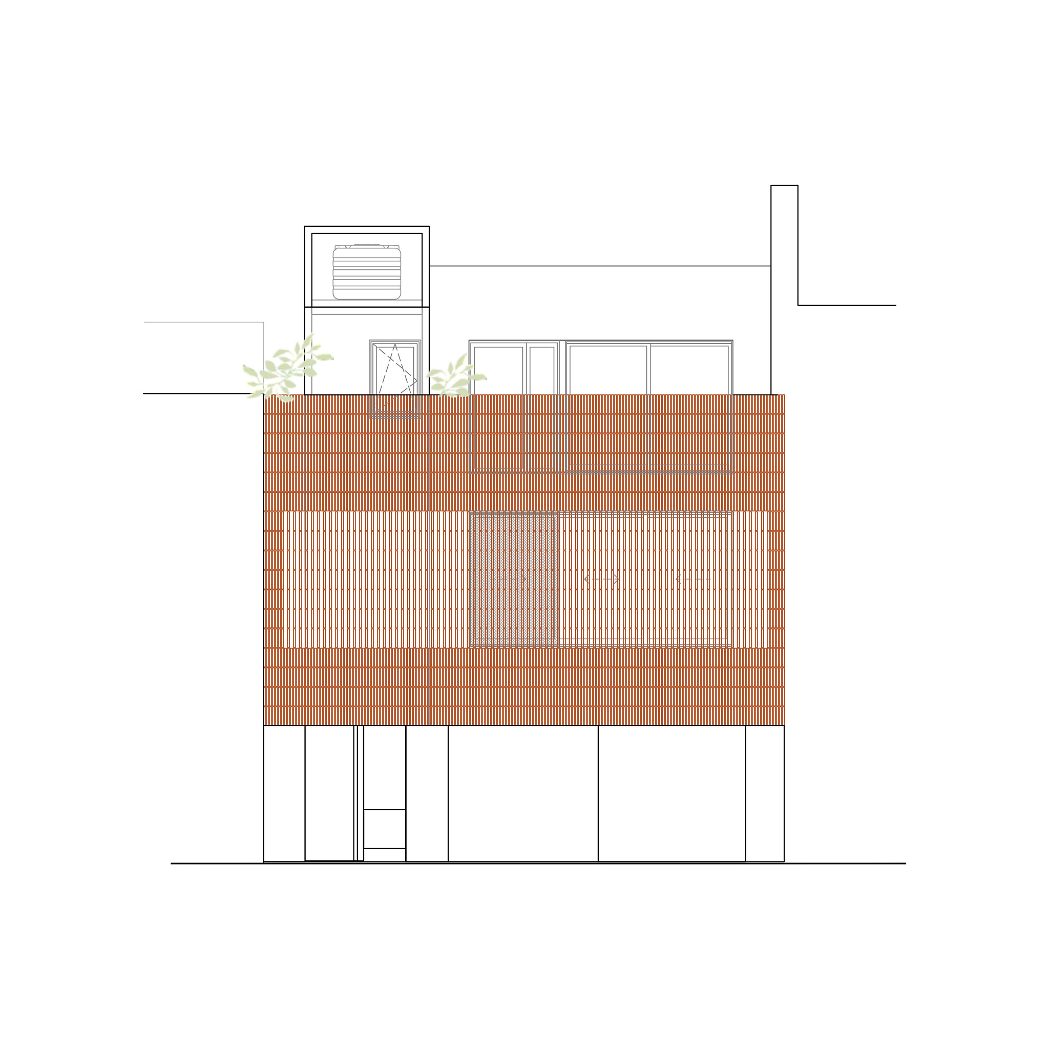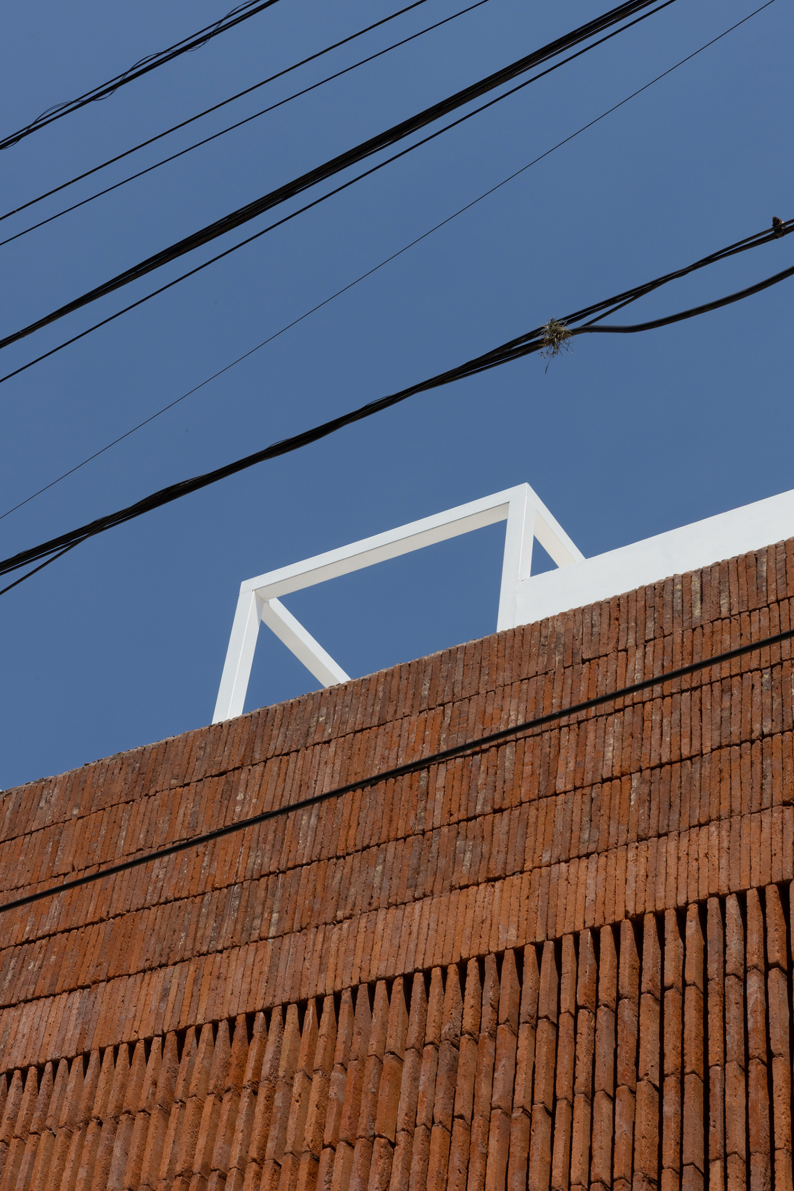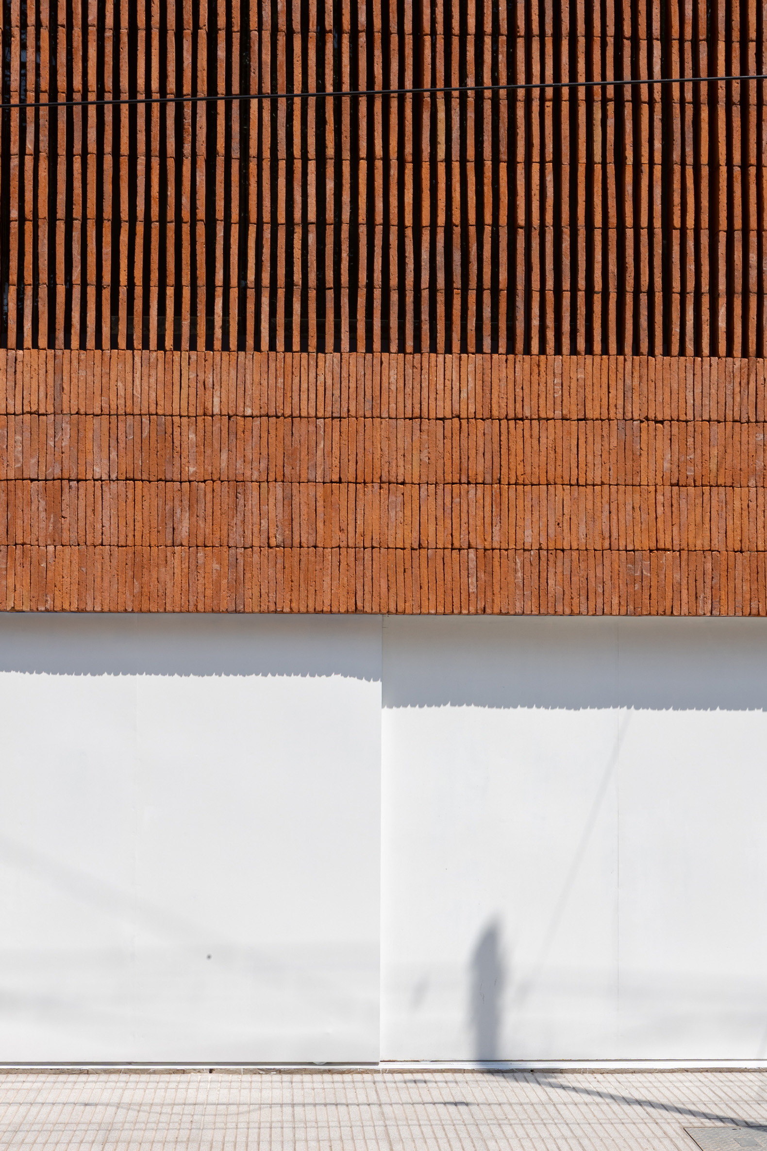 From its configuration and materiality, the facade appears as a solid piece with a brick envelope of the Cabildo type placed vertically, which acts as a visual and solar filter, creating a textured plane that also refers to the language of the neighborhood. The lower white and blind plane, materialized in sheet metal, emphasizes the gesture of a base that hides the access and technical uses, freeing the prominence to the brick plane.