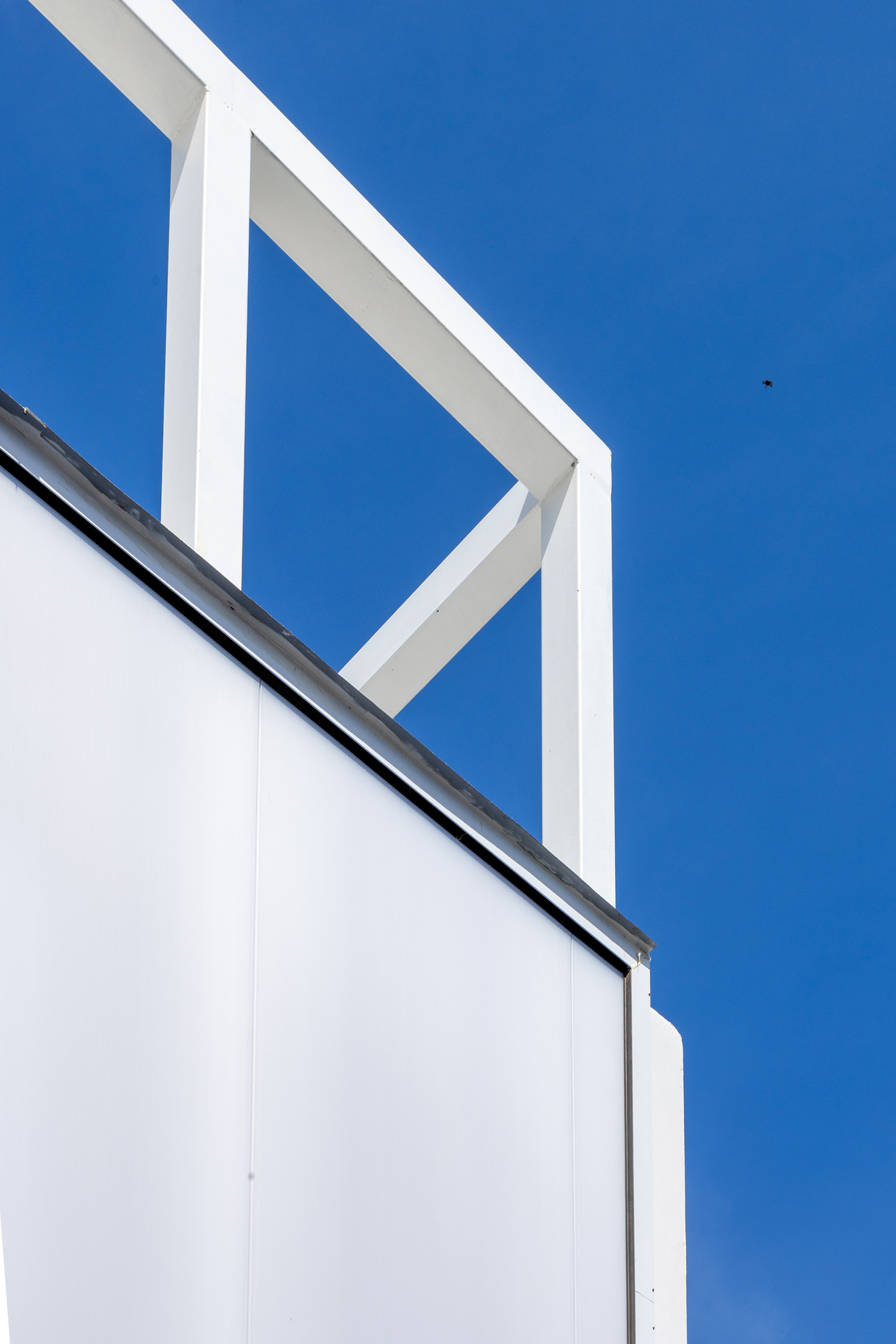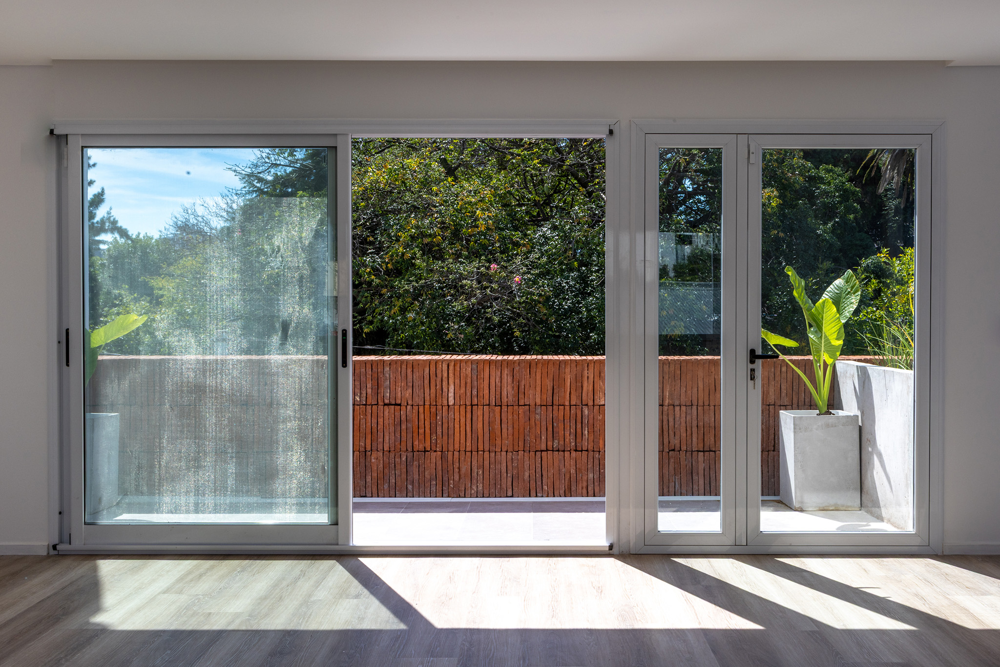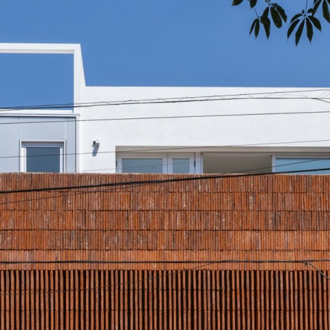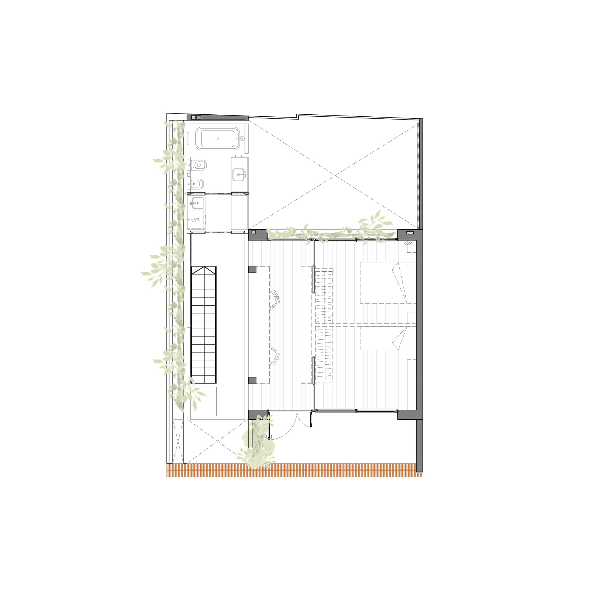 From its configuration and materiality, the facade appears as a solid piece with a brick envelope of the Cabildo type placed vertically, which acts as a visual and solar filter, creating a textured plane that also refers to the language of the neighborhood. The lower white and blind plane, materialized in sheet metal, emphasizes the gesture of a base that hides the access and technical uses, freeing the prominence to the brick plane.