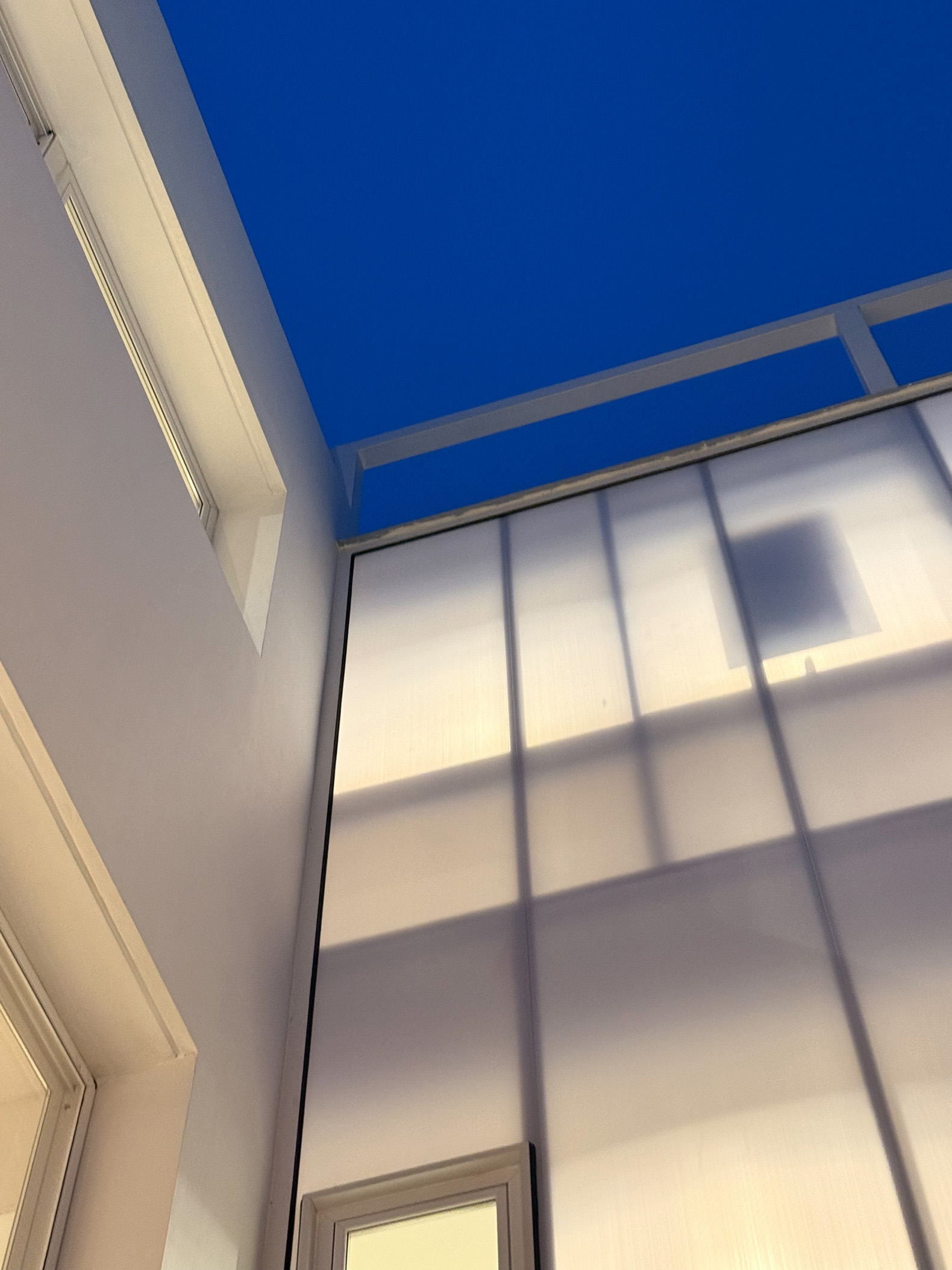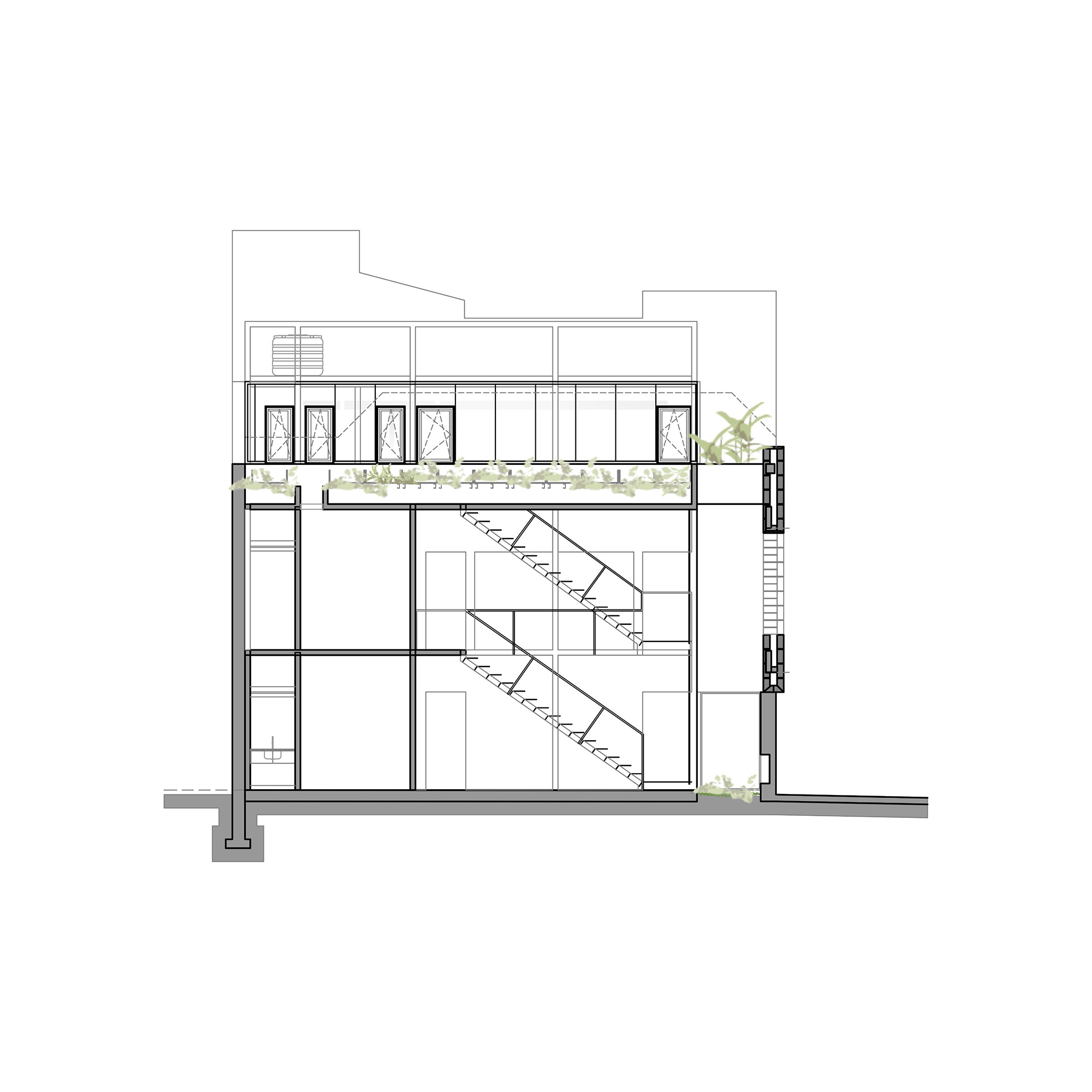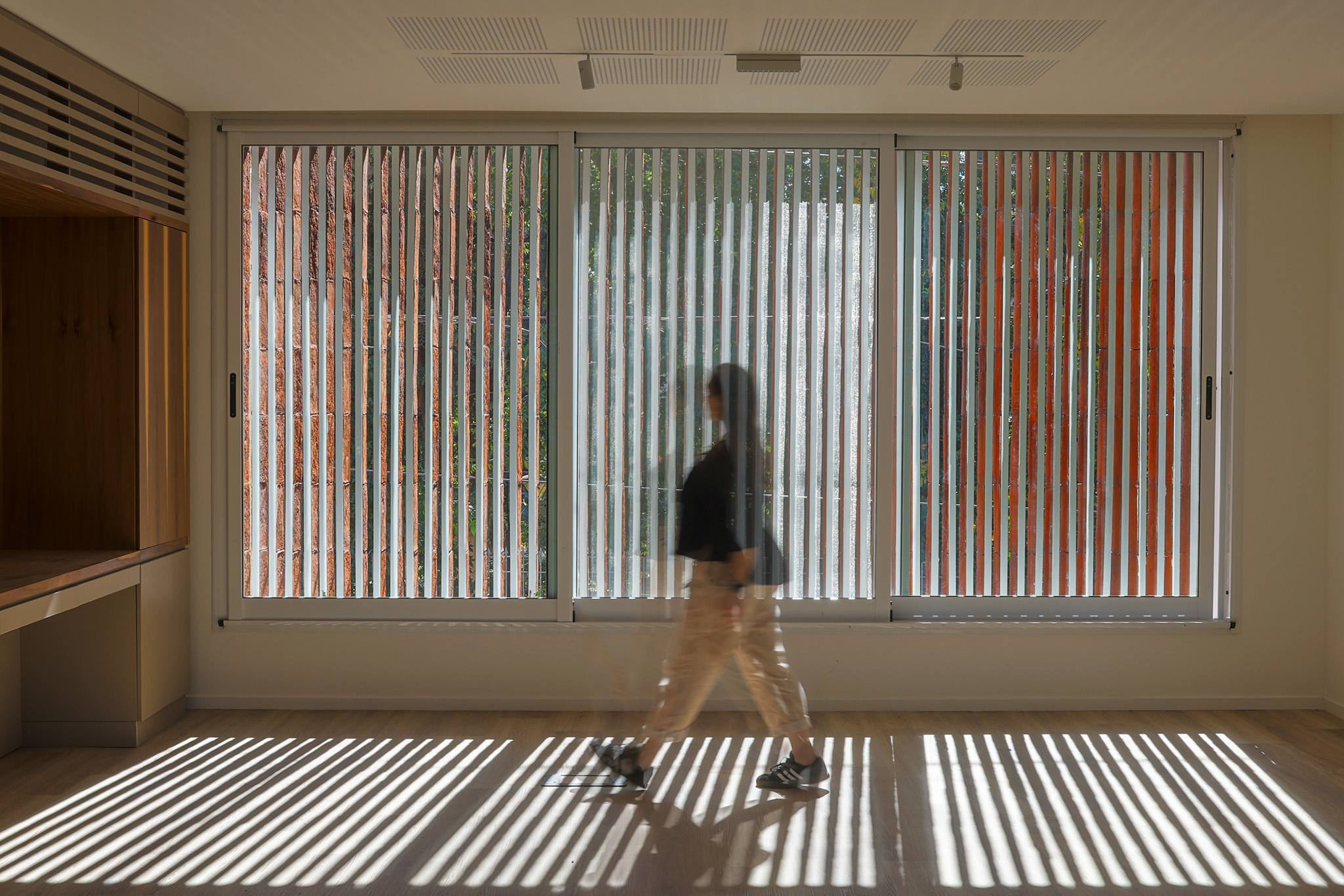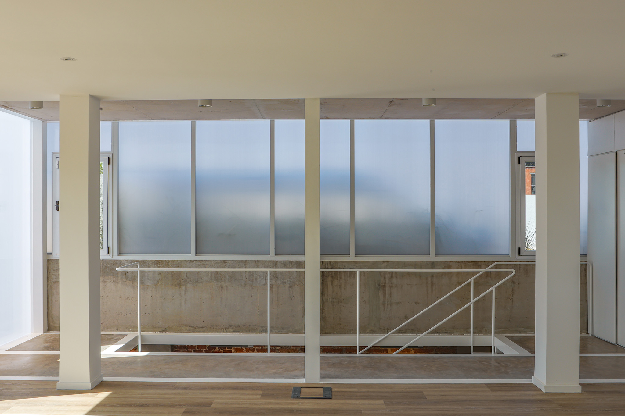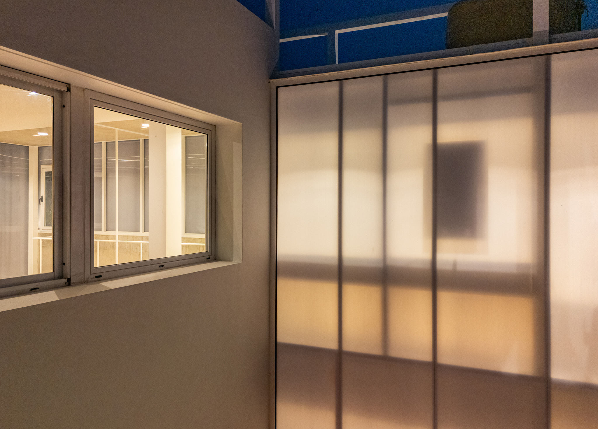 A translucent facade system is used, allowing the entrance of diffuse light during the day and functioning like an urban lamp at night. The courtyard, for its part, serves as a core for lighting and ventilation, visually connecting the different levels.