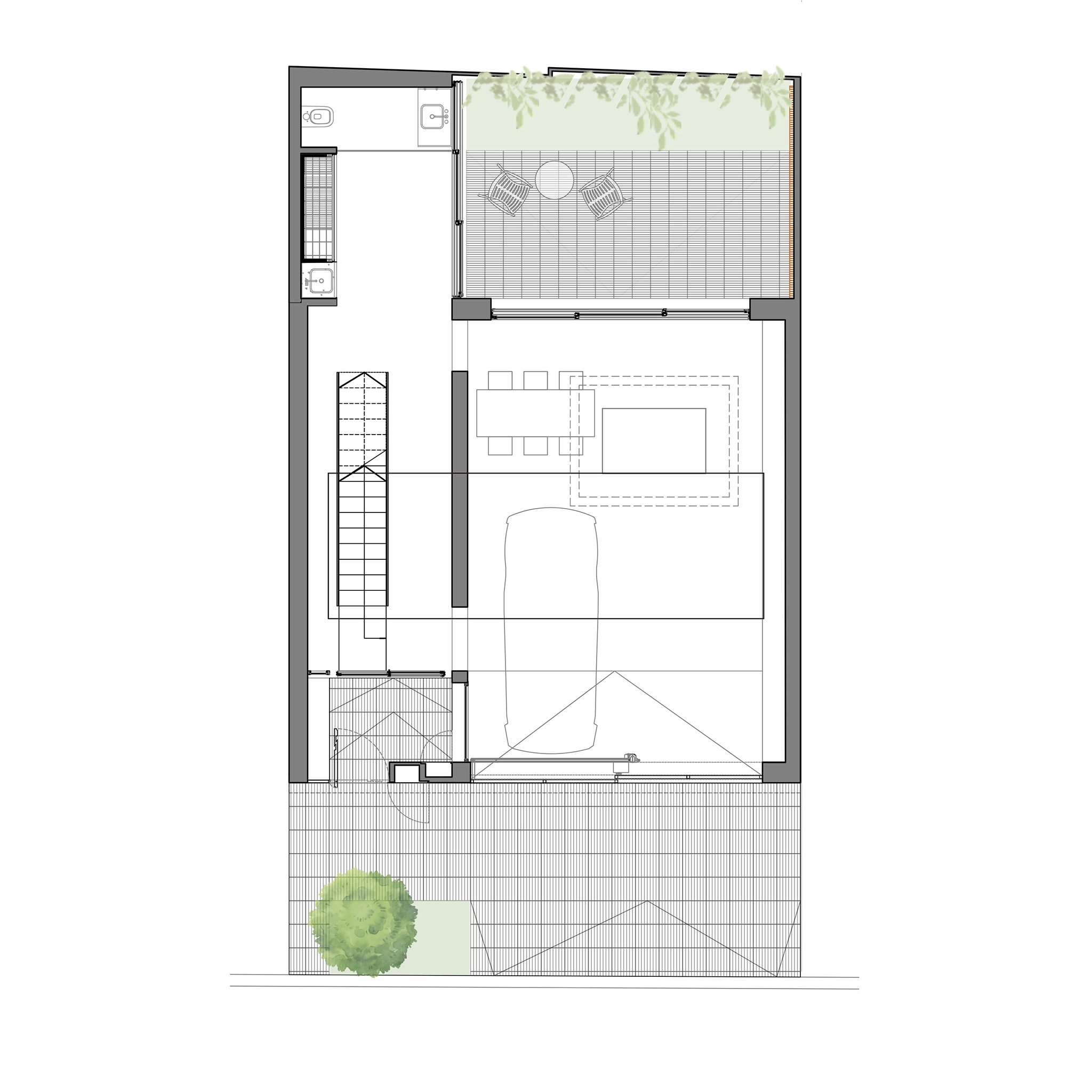 The proposal seeks to create a dwelling that maximizes interior livability while preserving privacy and optimizing the relationship with exterior space. The key operation is the consolidation of a compact and austere volume facing the street, which opens up to an interior patio, where a more permeable and luminous language is developed.