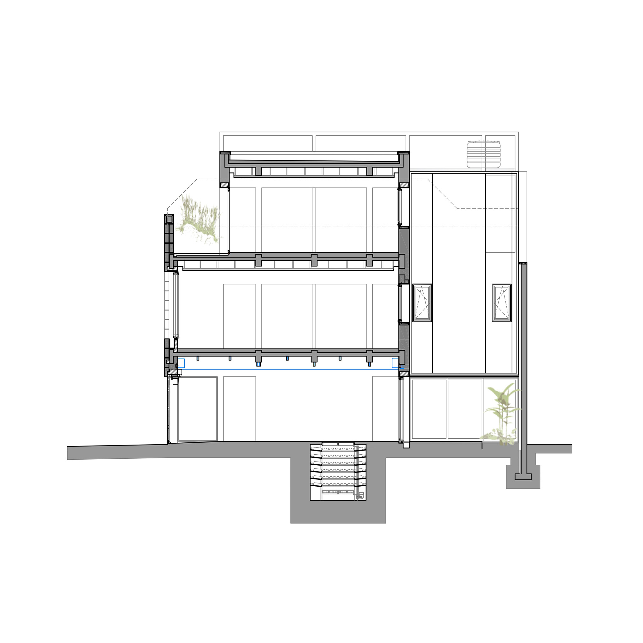 The different programmatic areas are arranged vertically across three levels. The ground floor houses the entrances, service areas, and expansion spaces, while the upper floors contain the more private spaces, always closely linked to the exterior through a series of landscaped terraces. The A1486 project can be summarized as a series of spaces fluidly connected vertically, prioritizing flexibility and natural light.