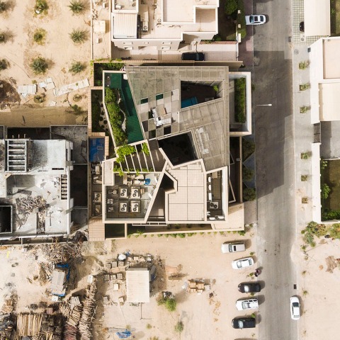 The same perforated skin that serves as a filter on the roof -a “deployé” metal mesh of anodized aluminum- has been used to maintain the privacy of the inhabitants from the neighbors’ eyes and to filter direct sunlight, serving as a shelter for the vegetation inside the aggressive Kuwaiti climate.