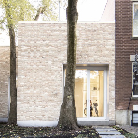 From the onset, the intention was to celebrate the minimal, practical qualities of the original typology -- to preserve the feeling of the “maison de plain-pied” and to give the extension an iconic quality rooted in a modern interpretation of the original one-story structure. In its reading from the street, the project asserts the proud but modest character of a “shoebox” house through contemporary means and geometric abstraction. Its textured pale brick façade is curved around a tree on one side and punched with a modern, open, and bright entry on the other. Inside, a translucent closet block separates the living space from the bicycles in the front entrance. It unabashedly allows inventory of readily available outdoor gear, filtering light, and obscuring passing views. The project acknowledges the home’s heritage, its immediate context, and its contribution to the street.