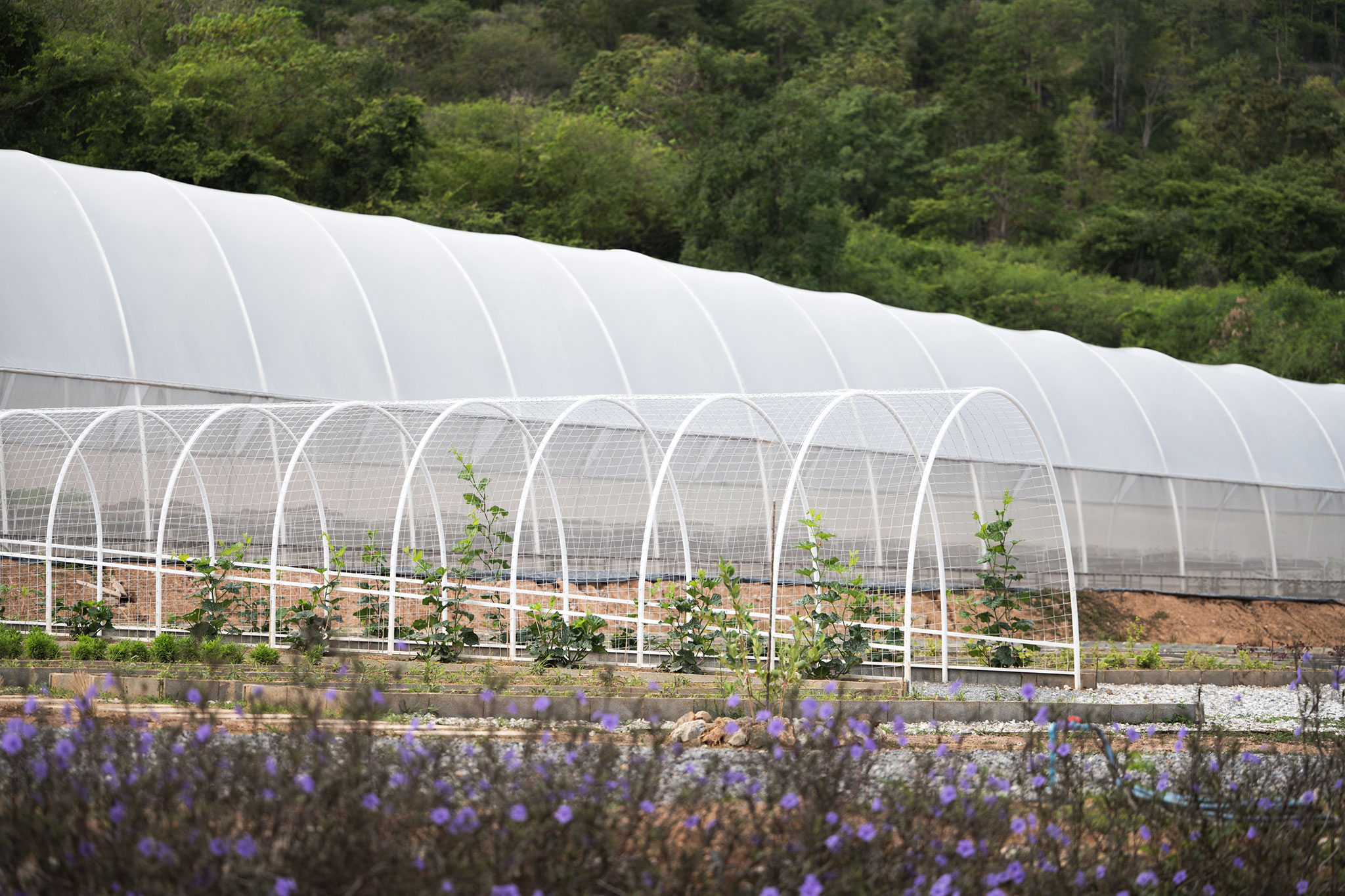 Further inside, a The agricultural greenhouse lies next to the utility zone. The greenhouses are oriented according to prevailing wind and sun directions, and their stepped roof heights accommodate different plant types, from ground cover to climbers and trees, based on their light needs. The main greenhouse consists of two arched structures aligned along an axis that does not obstruct water flow. (The first building features a height ranging from 2.75 meters to 5.00 meters, designed for growing taller plant varieties in the future. Currently, a variety of kitchen herbs and vegetables are being cultivated, including sesame leaves, rosemary, celery, green onions, cilantro, chili, and basil. The second greenhouse is taller, reaching between 3.00 meters and 7.50 meters, and is intended for growing crops like cantaloupe, tomatoes, figs, celery, and various salad greens such as bok choy and chili).This zone acts as the canteen feeding both guests staffs and supplying produce to restaurants in Bangkok.