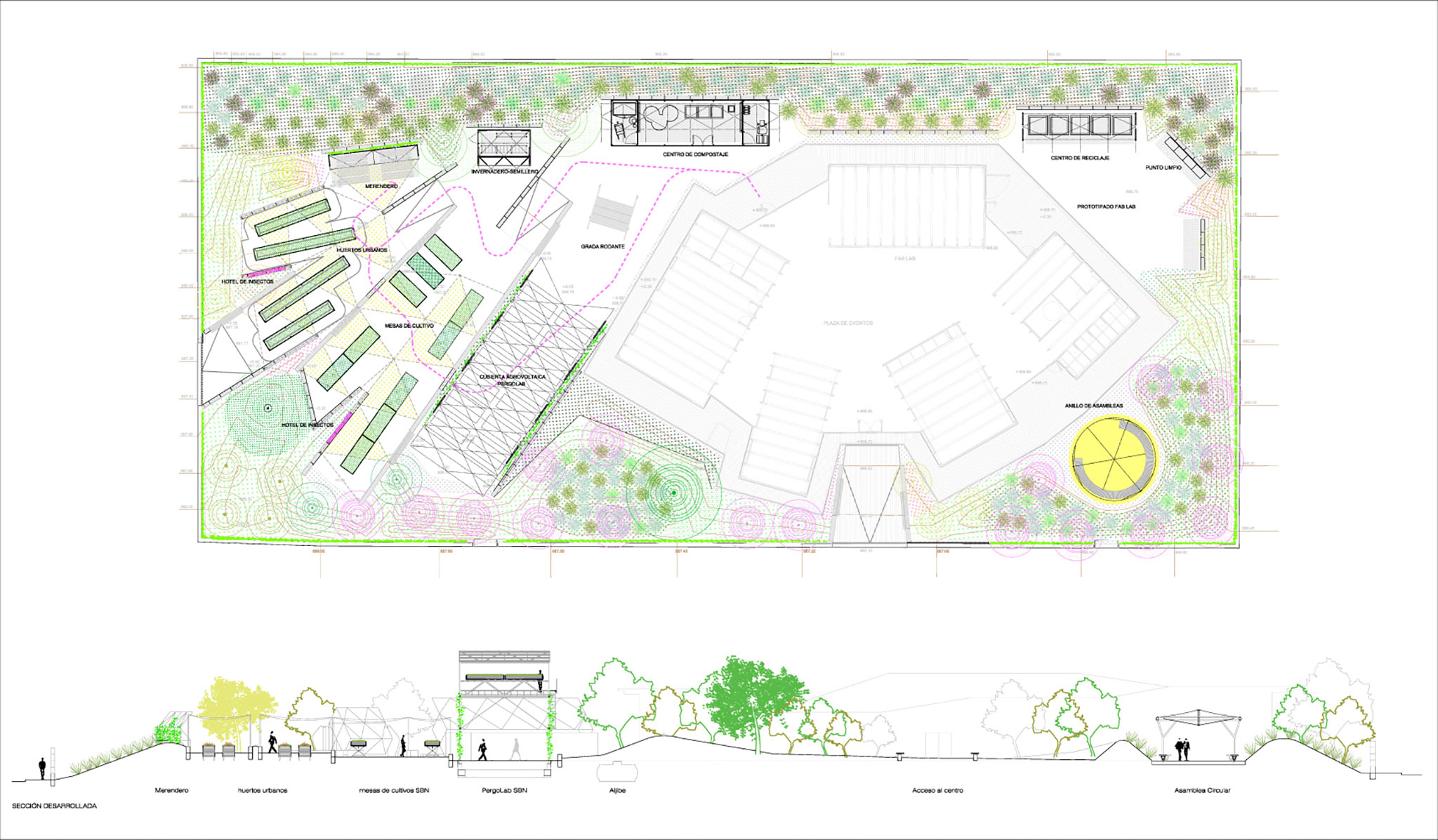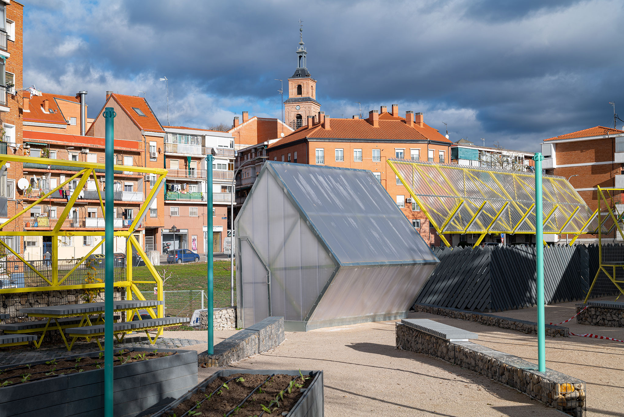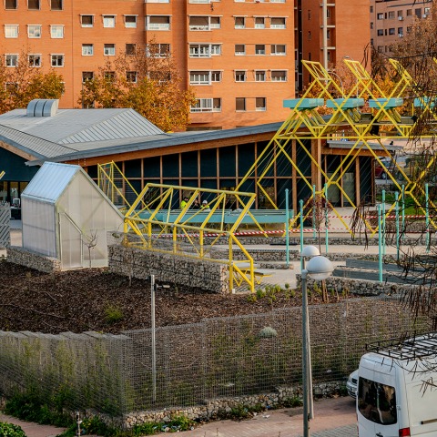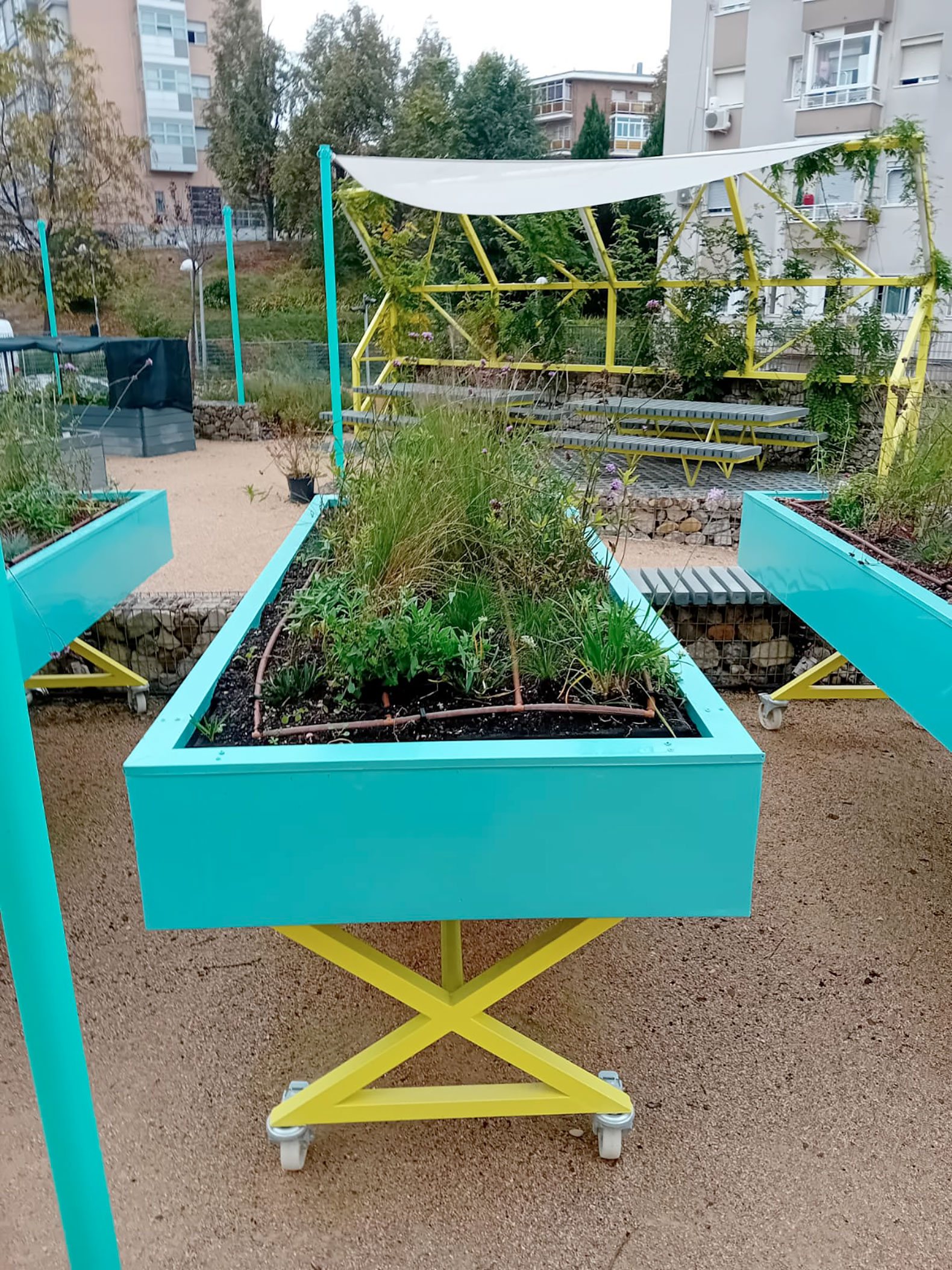 The garden is conceived as a productive ecosystem, with its ground cover of fruit trees, ground cover plants, and shrubs—endemic and native species—along with the raised beds of the urban vegetable gardens. Surrounded by aromatic and fruit-bearing plants, these gardens attract diverse pollinators—insects, birds, bats—and address the challenges of food sovereignty in urban environments. The insect hotels, integrated into the gabion walls, are also made with various waste materials. The composting facility produces compost from the waste of the Center and the garden, which is then recirculated as fertilizer. The recycling station recirculates leftover material used in FabLab activities. Finally, the SBN laboratory, comprised of ground-level growing tables and those located atop PergoLab, will test and monitor various green roof solutions—both intensive and extensive—for implementation on Madrid's rooftops. This represents a local and effective action against the climate emergency, while also promoting urban biodiversity. The garden itself will be used to test sustainable crops adapted to the local climate, and the urban gardens will be used to test different species and organic fertilization solutions.