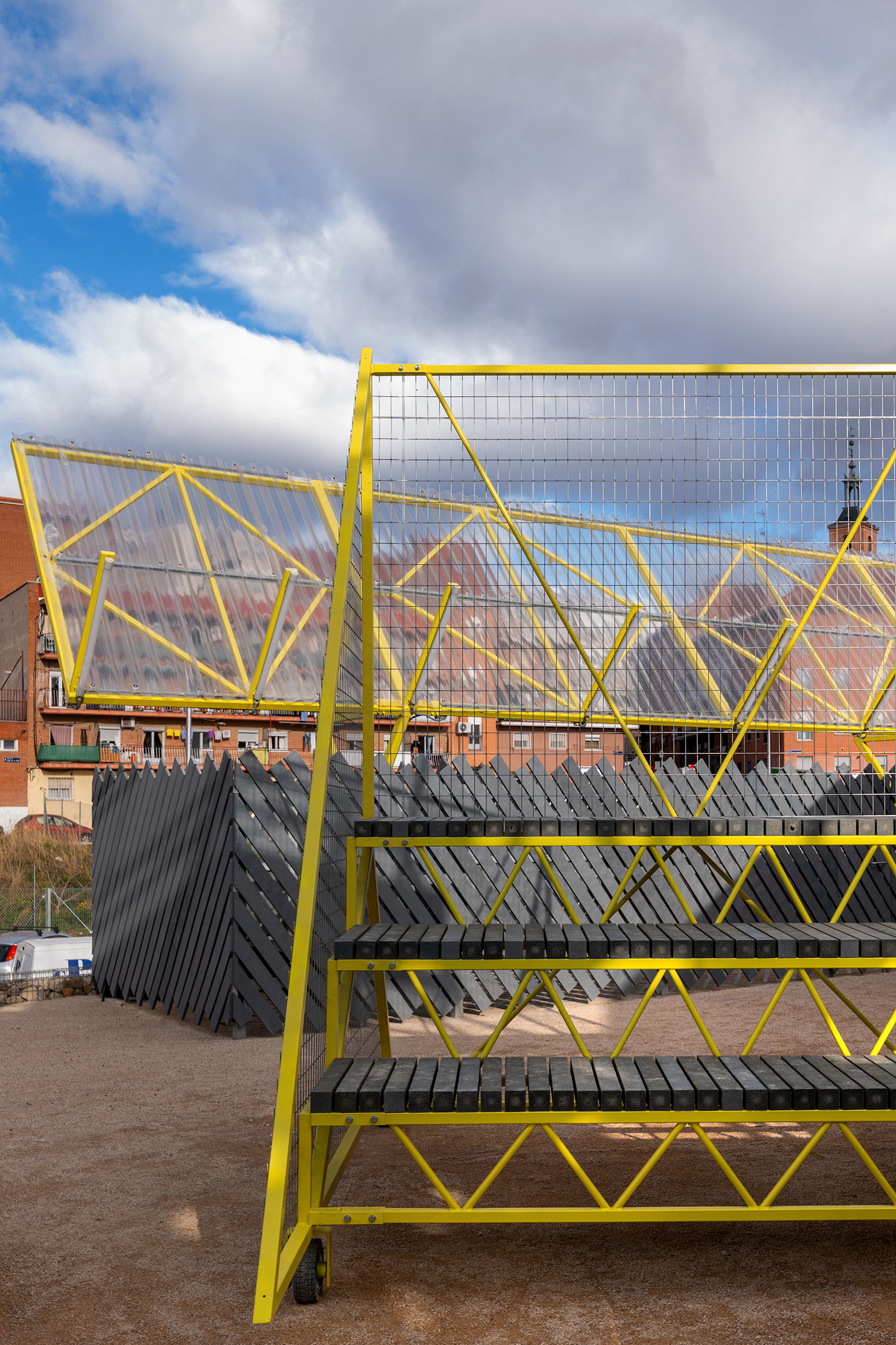 For the construction of the pavilions, a demountable and bolted steel structure was chosen, materialized with circular solutions that turn waste into resources, such as the demolition rubble used to fill the gabions of the fence and the platforms, the existing earth fills to form the slopes and platforms adapted to the topography, and the crushed tire rubber for the continuous and flexible pavement.