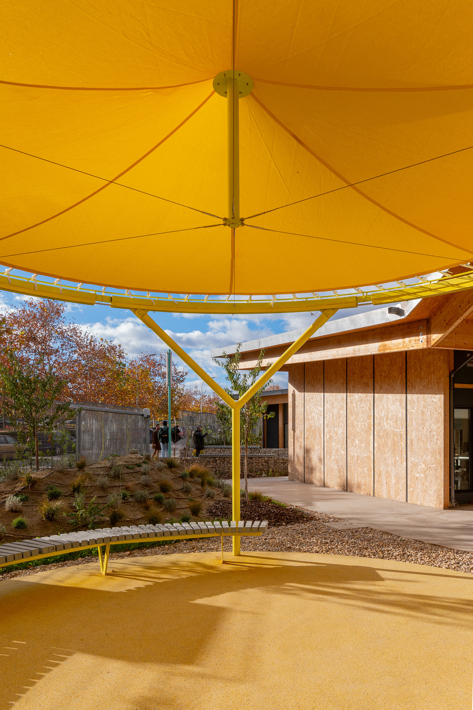 The garden designed by gaSSz architects is conceived as an open and inclusive space organized on several platforms adapted to the topography, and featuring a wide variety of plant species. The garden is intended for outdoor activities and, at the same time, serves as a complement to the interior spaces for research, education, and outreach. The garden is structured around several pavilions: the composting and recycling stations, the greenhouse, the shade house above the urban garden beds, the "Assembly Ring" picnic area, and the "PergoLab," a larger structure that houses a covered activity space, consisting of a movable platform and two walls of climbing plants.