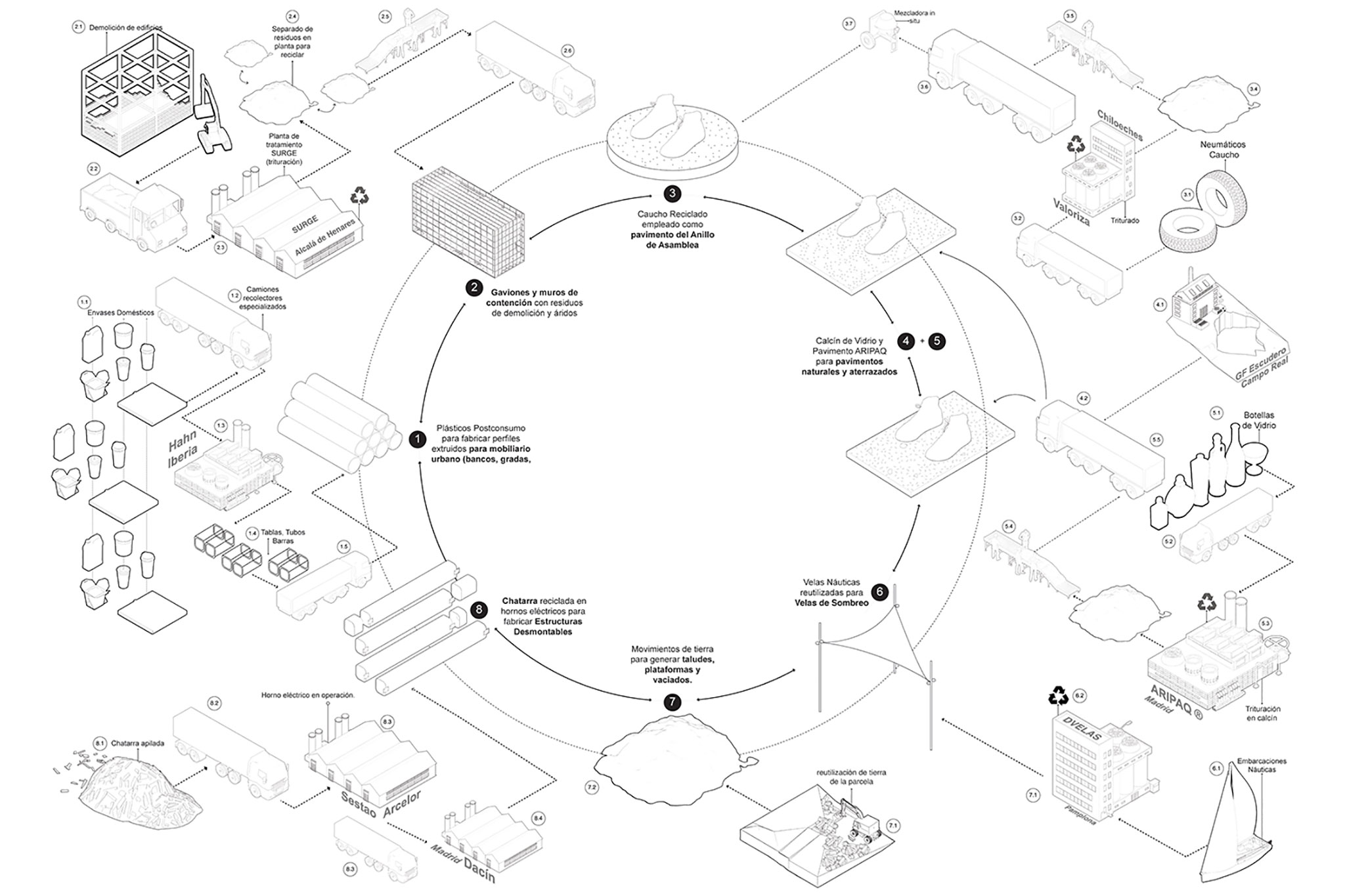 The collection of discarded and recirculated materials used in the construction of this public space has a direct impact on decarbonization and emissions reduction by harnessing their embodied energy. The CIEC Garden combines reversible strategies and demountable structures with circular material solutions that transform waste into resources: