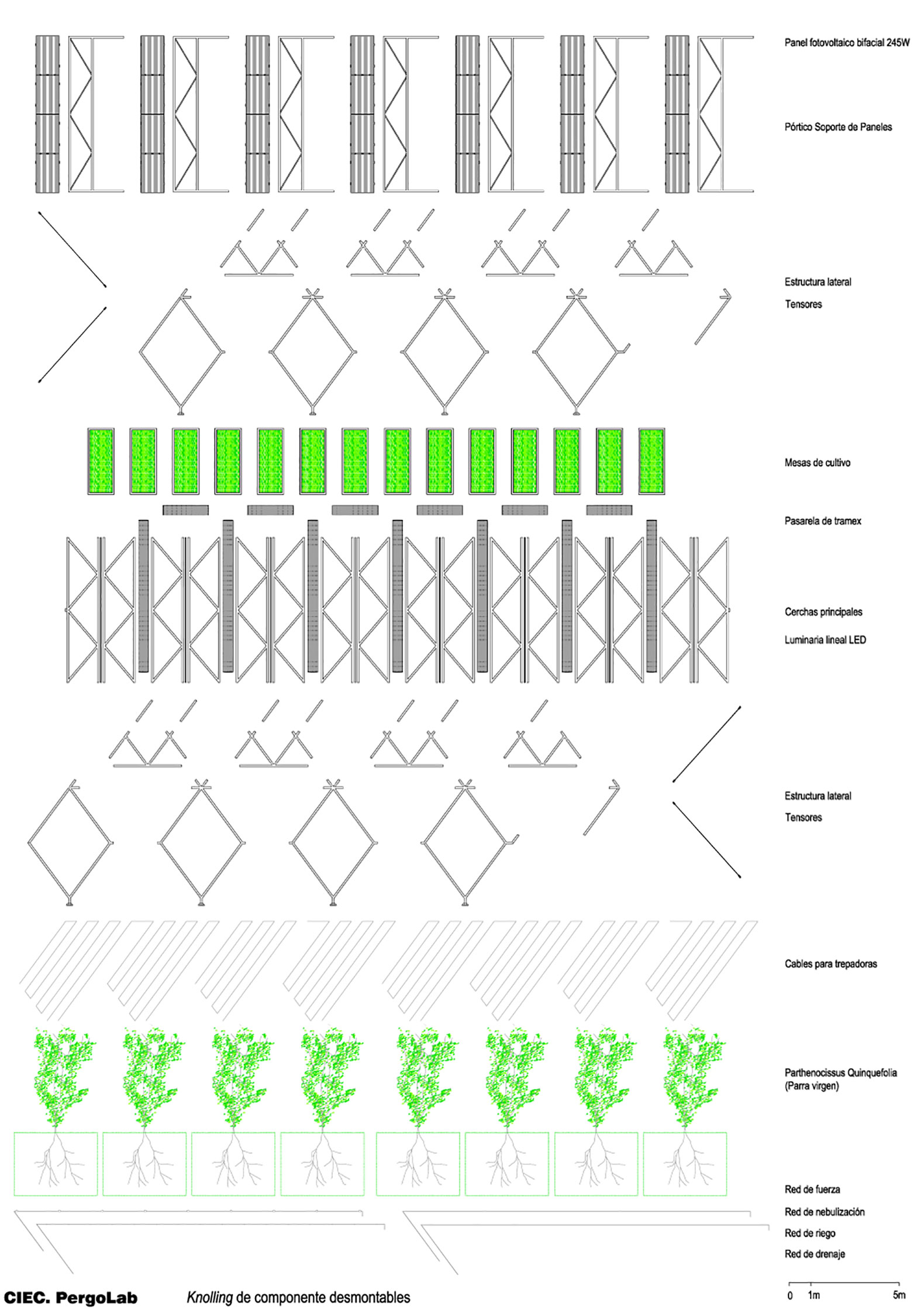 The CIEC's Circulating Garden is the prototype of an open, inclusive, and interspecies space for enjoying outdoor activities that complement those taking place in its interior spaces—research, meetings, education, outreach, etc. It is organized on several platforms or terraces adapted to the topography and contained by gabion walls filled with demolition rubble. The empty gabion cages serve to enclose the garden, supporting climbing plants. The garden is structured around several pavilions, built with a demountable and bolted steel frame: the Composting and Recycling Stations, the Greenhouse/Seedbed, the Shade House above the urban garden beds, the Picnic Area, the Assembly Ring, and the PergoLab, a larger structure that houses a covered activity space equipped with a movable tiered seating area and flanked by two walls of climbing plants. Its agrovoltaic roof forms part of the Nature-Based Solutions (NBS) Laboratory, along with the mobile raised beds or testbeds for cultivation. These structures function as conditioned outdoor rooms (B. Rudofsky) thanks to their shade elements, vegetation, and furnishings, serving as outdoor living spaces throughout the year, and even as climate refuges during the summer.