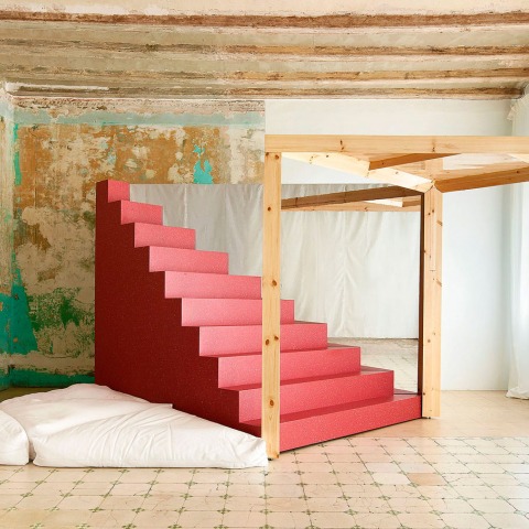 A staircase, a wardrobe, a platform and a cushion are the collection of furniture chosen by P-M-A-A to create a 30 m² room that evolves over time. The position of these furniture and the resulting combination between them results in different room possibilities in the same space. Each object is different to be able to separate from the set and relate to other objects.