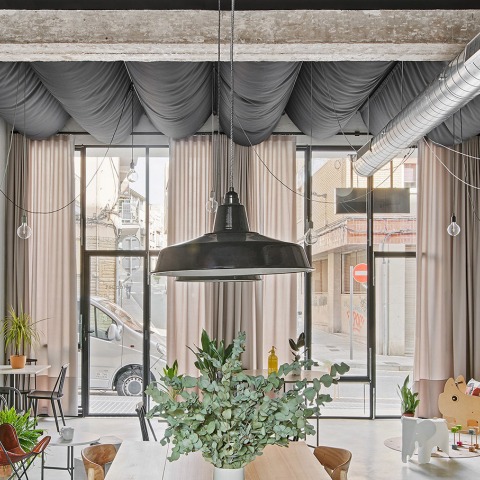 The entrance space is a cushion between the street and the central coffee space. The textile roof of inverted vaults transports us to a tent, an internal festive space, or an exterior pergola that is part of a garden. The design of furniture of different dimensions and materials and the incorporation of vegetation give rise to a relaxed area, where the little ones also find their play space. The interior and exterior qualities of the space are regulated by the large metal entrance carpentries, which, in turn, formalize a bench and a table that appropriate the street.