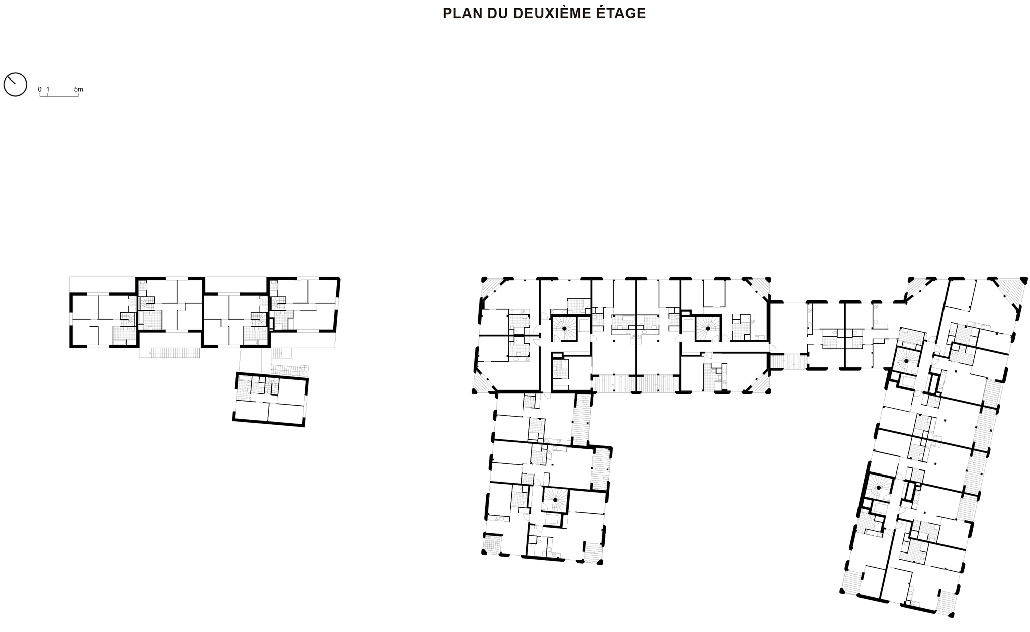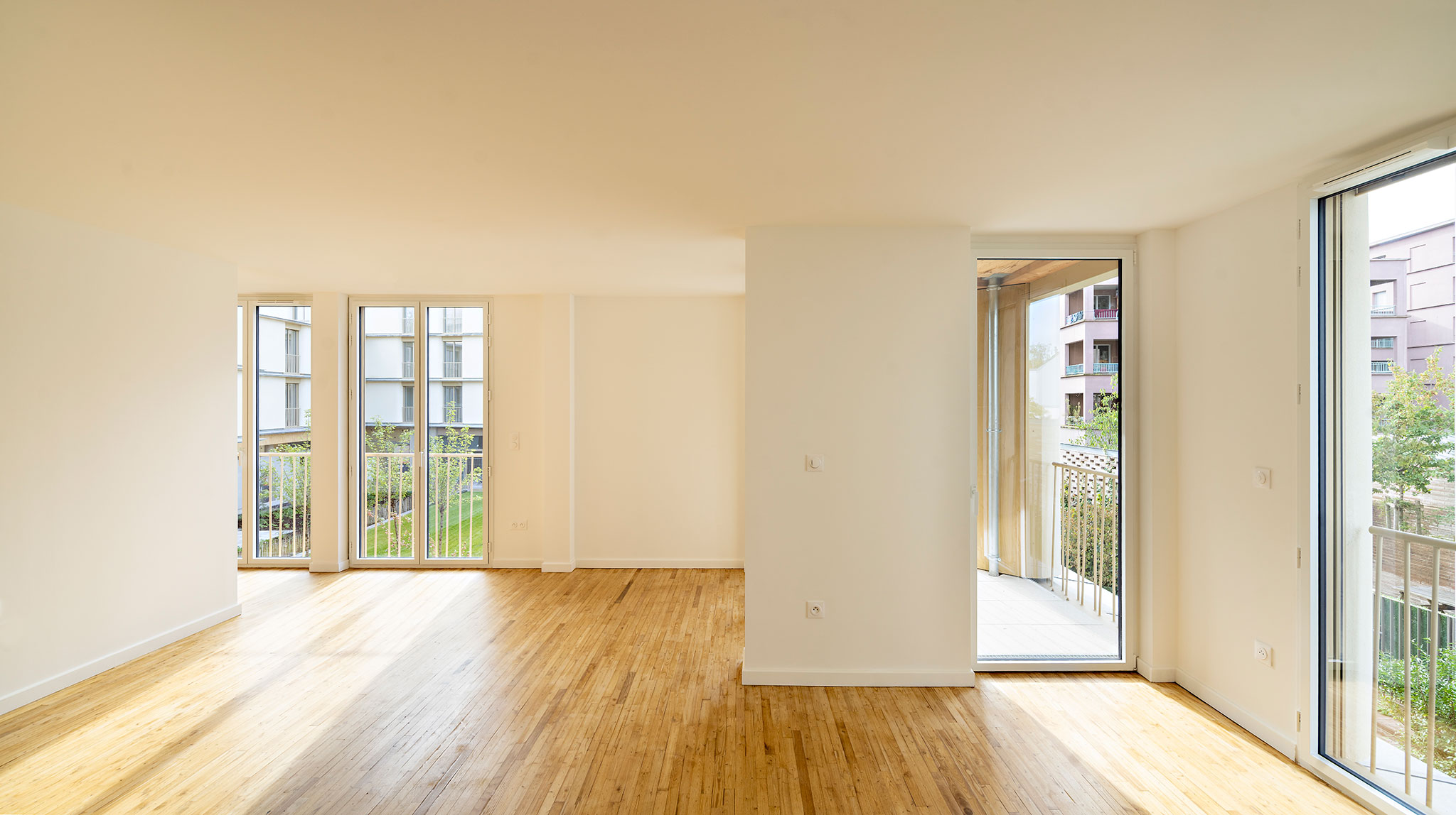 Flats benefit from varied, contextual qualities: the heart of the city block, the southerly oriented plaza with a view towards the neighbourhood, the planted mall and its public spaces, as well as the residential street with its low volumes and gardens. The lower stratum is continuous and compact. It offers a maximum number of flats with double exposure, extended by the winter gardens. The quality of flats on the upper floors is achieved with large corner balconies, creating an atypical typology of exterior spaces in terms of their exposure to sunlight and range of uses.