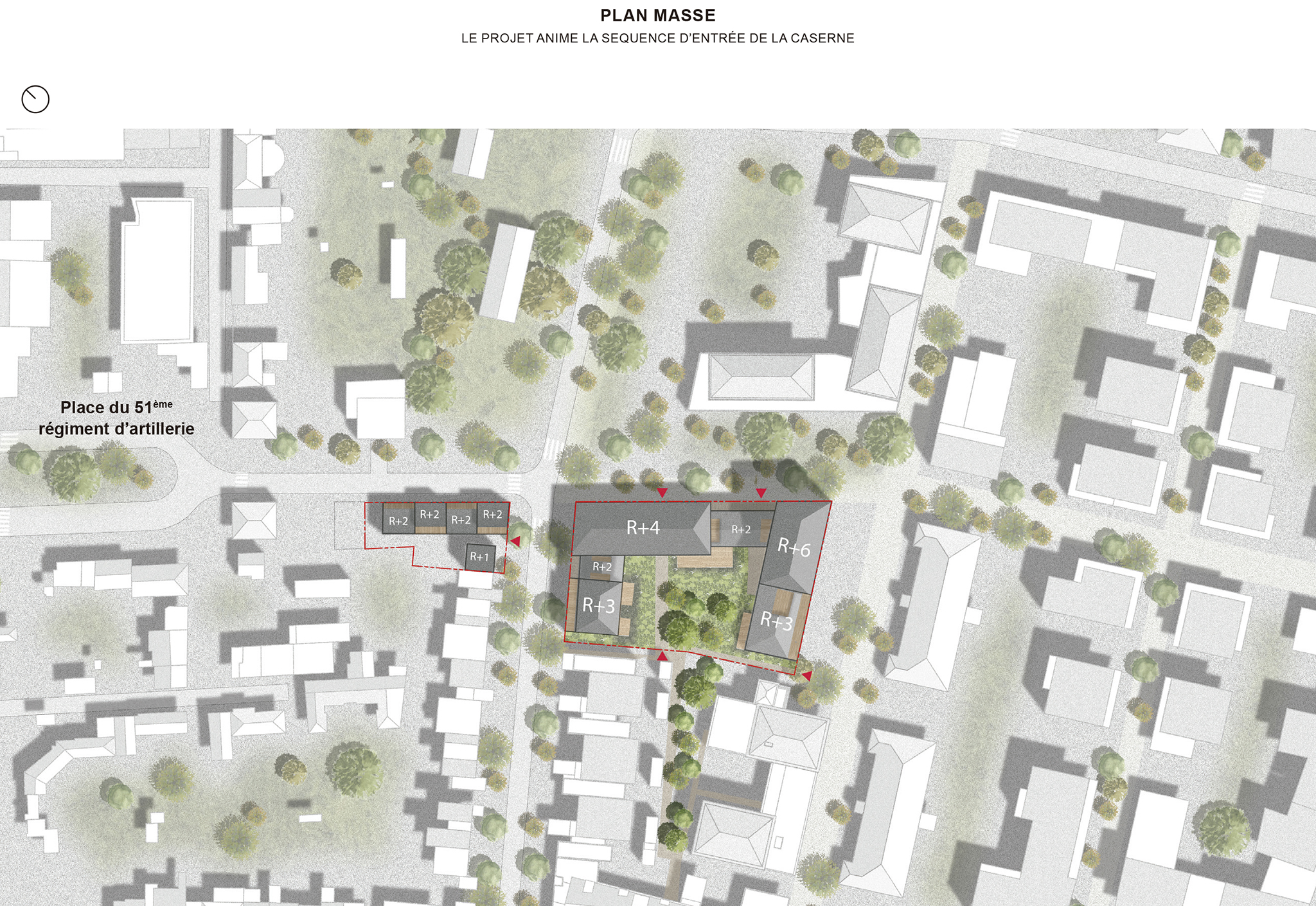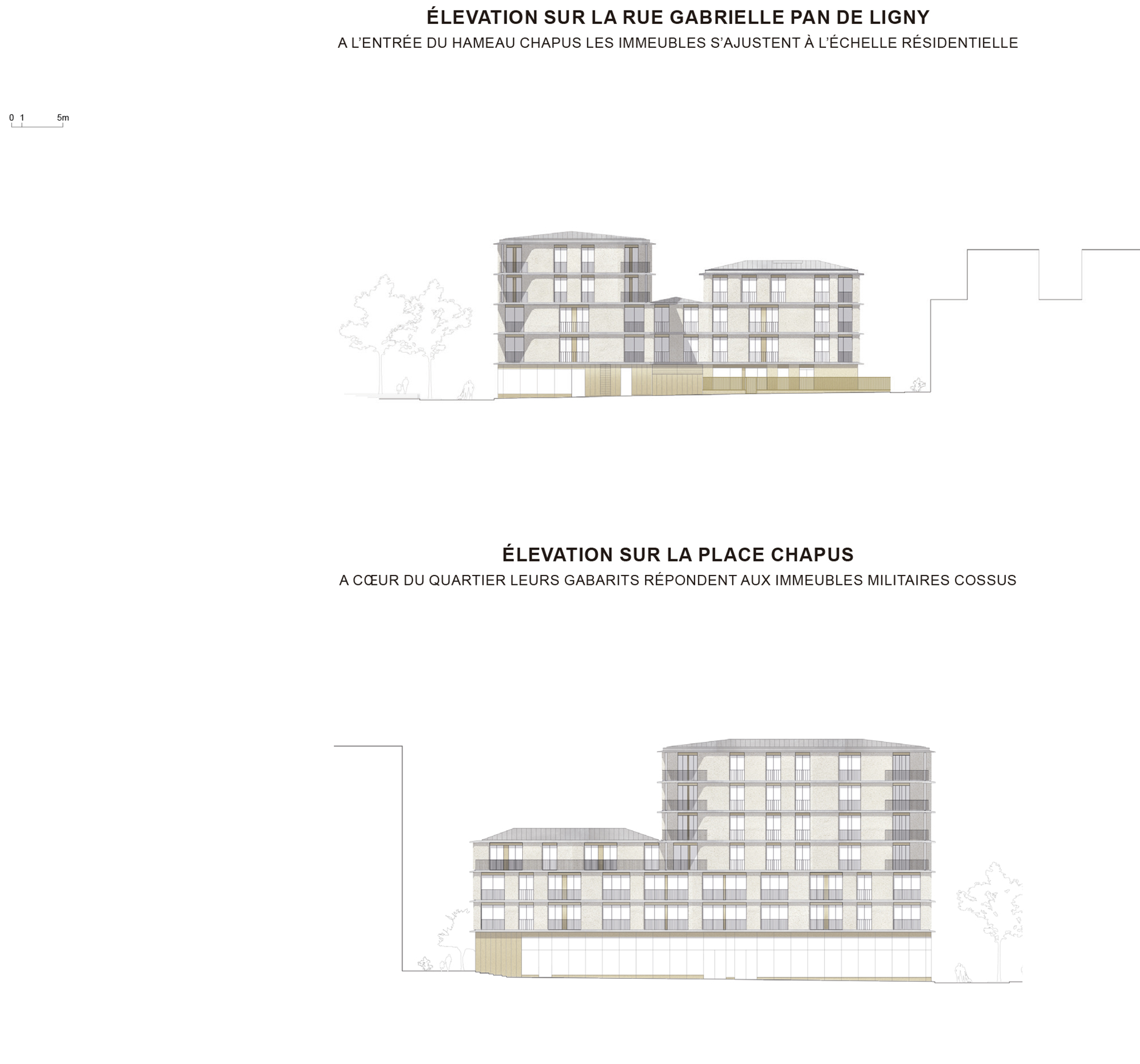 The sequencing of upper and lower levels and the scale of volumes echoes the retained characteristics of barracks architecture. The domesticity of the project is expressed in the scale of windows, in its proportion, and in its ornamentation. The rhythm of the façade reflects the arrangement of the flats, and makes it possible to sequence the volumes, thanks to alternating large bays and hempcrete trumeaux with rounded edges.