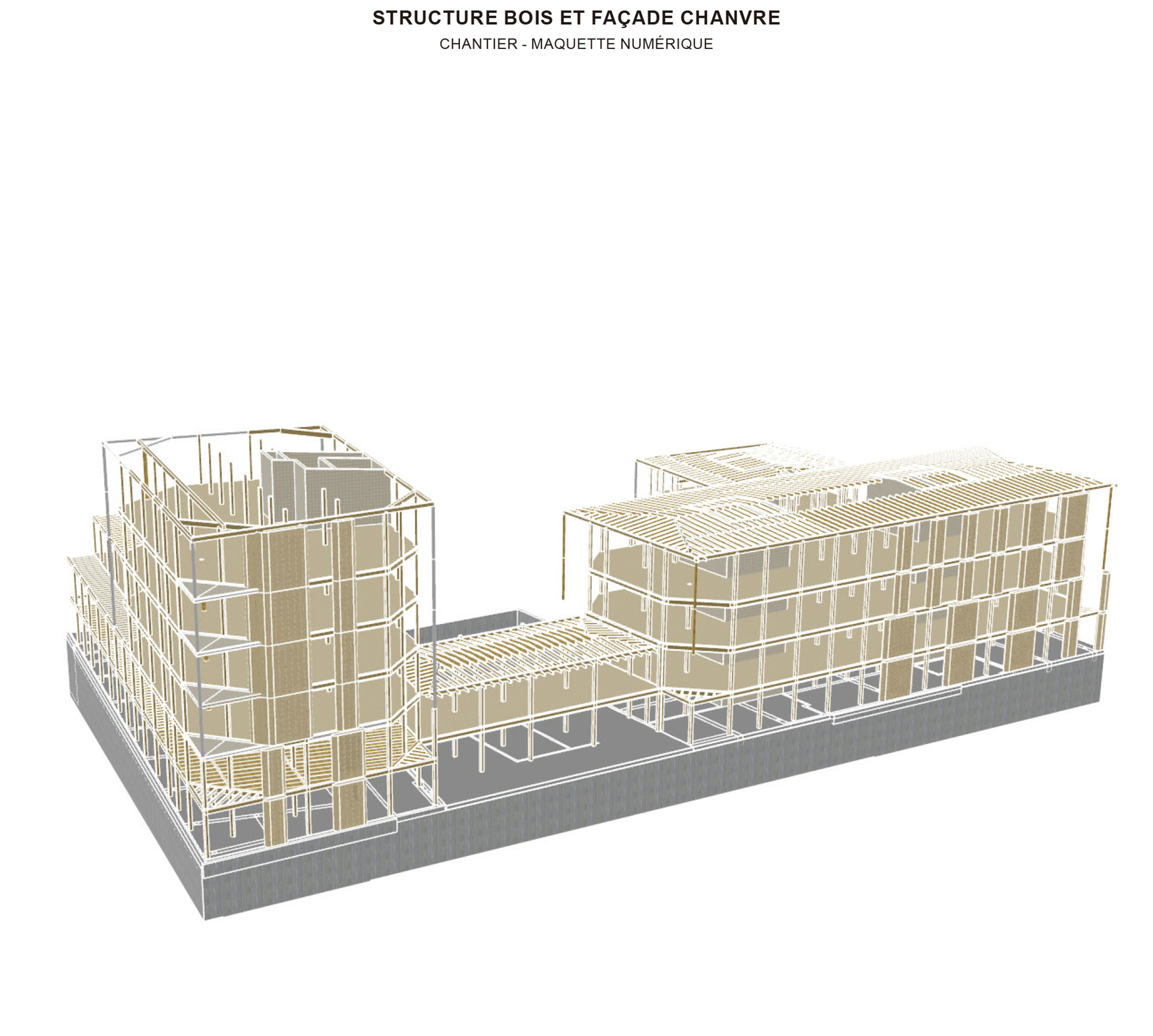 The building was constructed using a timber frame and prefabricated hemp concrete panels (made from hemp, lime, and water). Concrete was chosen for the infrastructure, including the ground floor, staircases, and elevator shafts, while the apartment building itself is constructed with a post-and-beam, slab, and timber frame.
