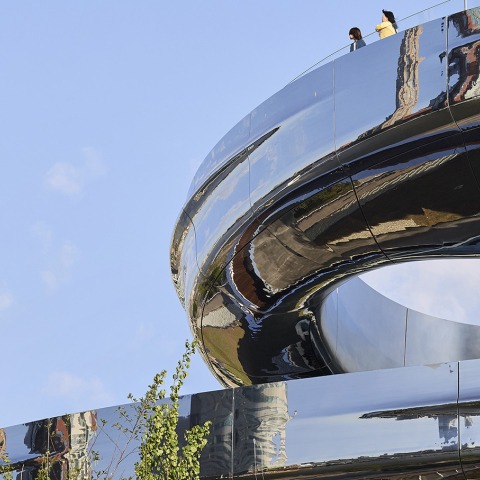 The new ramp-staircase has a spatial lattice structure with large overhangs. Its exterior surface is clad in silver-plated stainless steel, molded and polished using CNC technology, with a reflective finish. The new garden roof improves thermal insulation and significantly reduces energy consumption. Its configuration also allows rainwater to be retained in the substrate, facilitating natural evapotranspiration and water recycling.