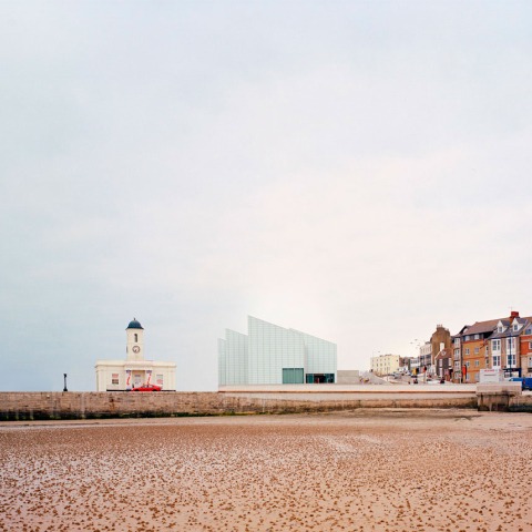 The new two-storey building is designed to maximise both the dramatic setting between sea and land and the extraordinary light conditions unique to this area that inspired Turner well over a century ago. It is composed of six identical crystalline volumes with monopitched roofs providing north light to the gallery spaces and revealing daily and seasonal light changes. Turner Contemporary offers spectacular views to the sea, connecting visitors to the broader landscape whilst encouraging a sense of participation in the community. The gallery is visible from the railway station across the sandy beach and forms a focal point on the horizon. As the seafront is occasionally flooded, the building has been raised on a plinth and its immediate surroundings provided with a hard landscape.