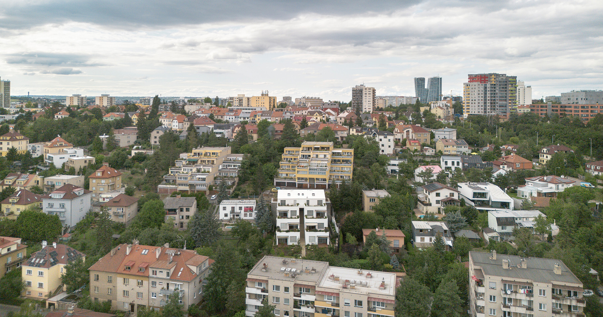The steep slopes of Prague's Krč district, rising from the Kunratický potok (brook) towards the north above today's south junction motorway, were still a hundred years ago the territory of vineyards belonging to a small village called Lower Krč and a few isolated farmsteads. In the first half of the 20th century, the vineyards were parcelled out for the construction of family houses and villas with gardens, but over time, a very diverse development emerged in the complicated terrain.