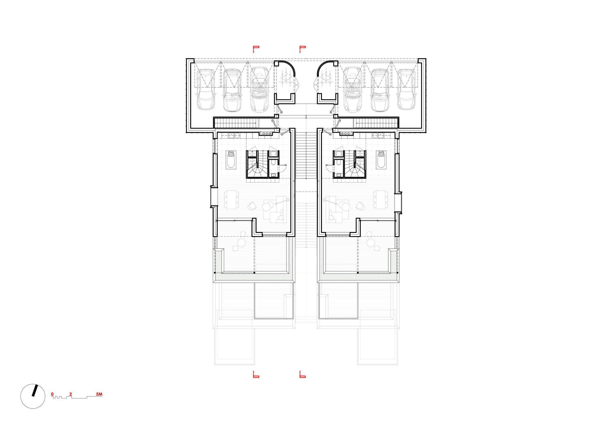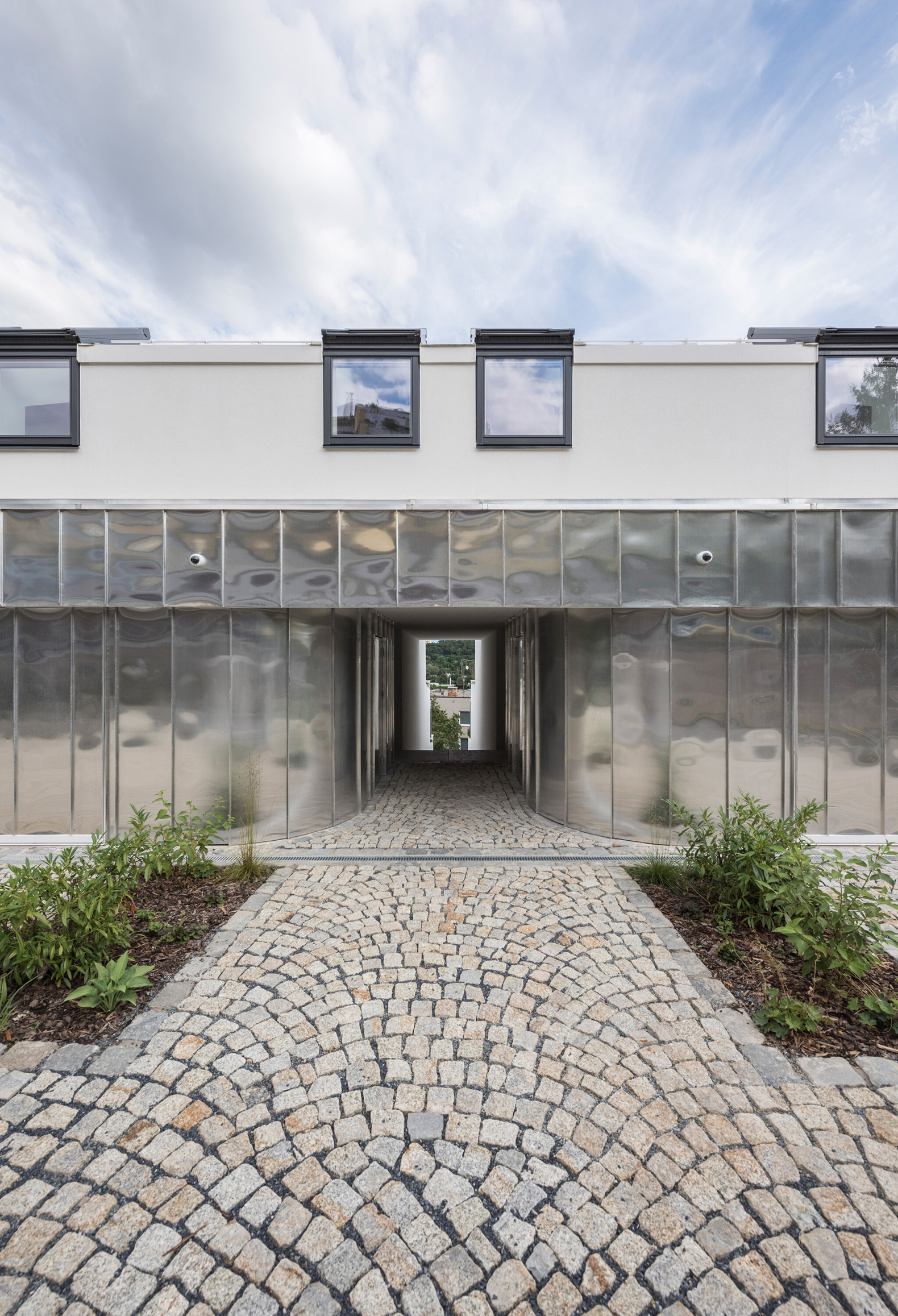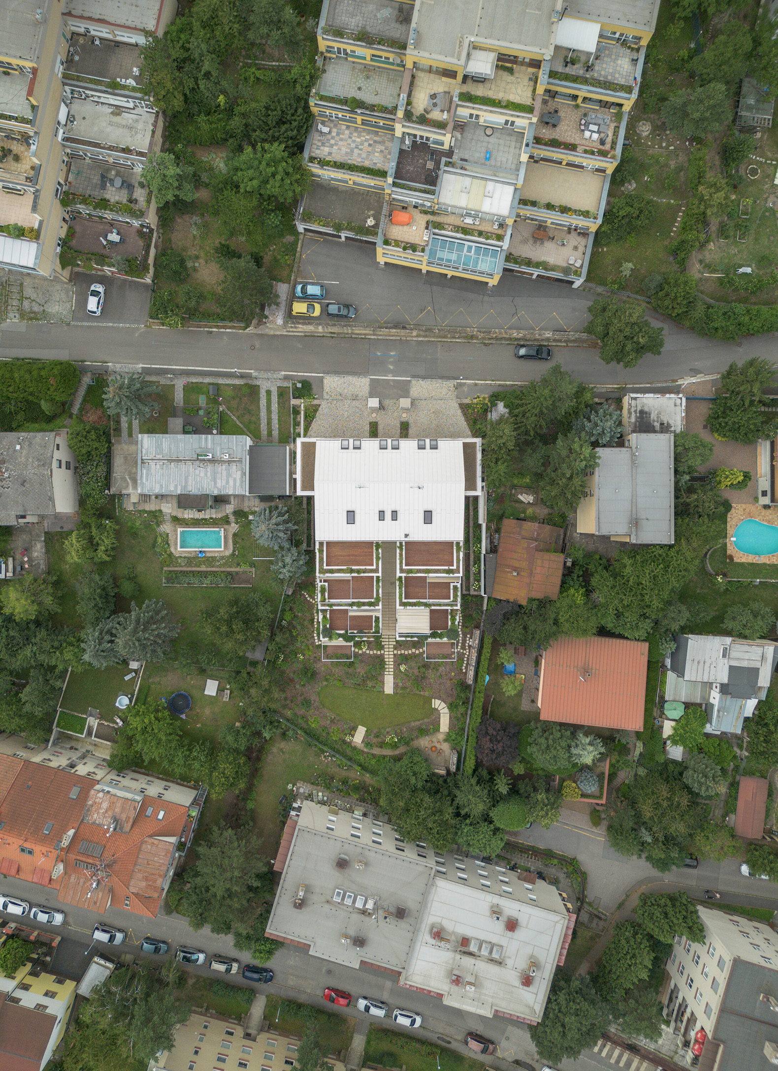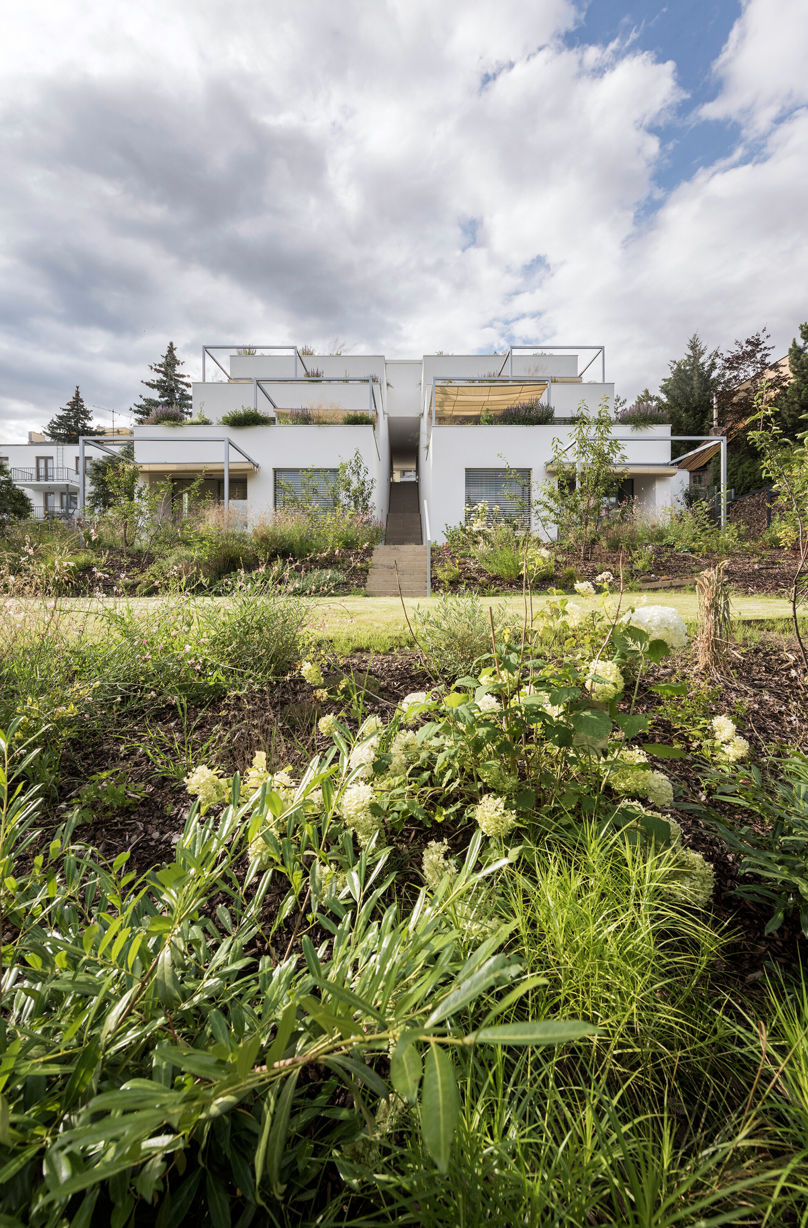 The entrances to the apartments are from an external staircase that intersects the house on the axis between the two sections and is partially covered by the volume of the attic. This distinctive slice through the building also connects the street and the garden, which is almost 8 metres lower. The layout was inspired by classic apartment villas: each of the two symmetrical houses contains three larger residential units (3-bedroom, 2-bedroom and a 3-bedroom duplex) with separate entrances and shared facilities with cellars, garages and bicycle storage rooms. The garden with a fireplace and mature greenery (both original and newly planted) is shared.