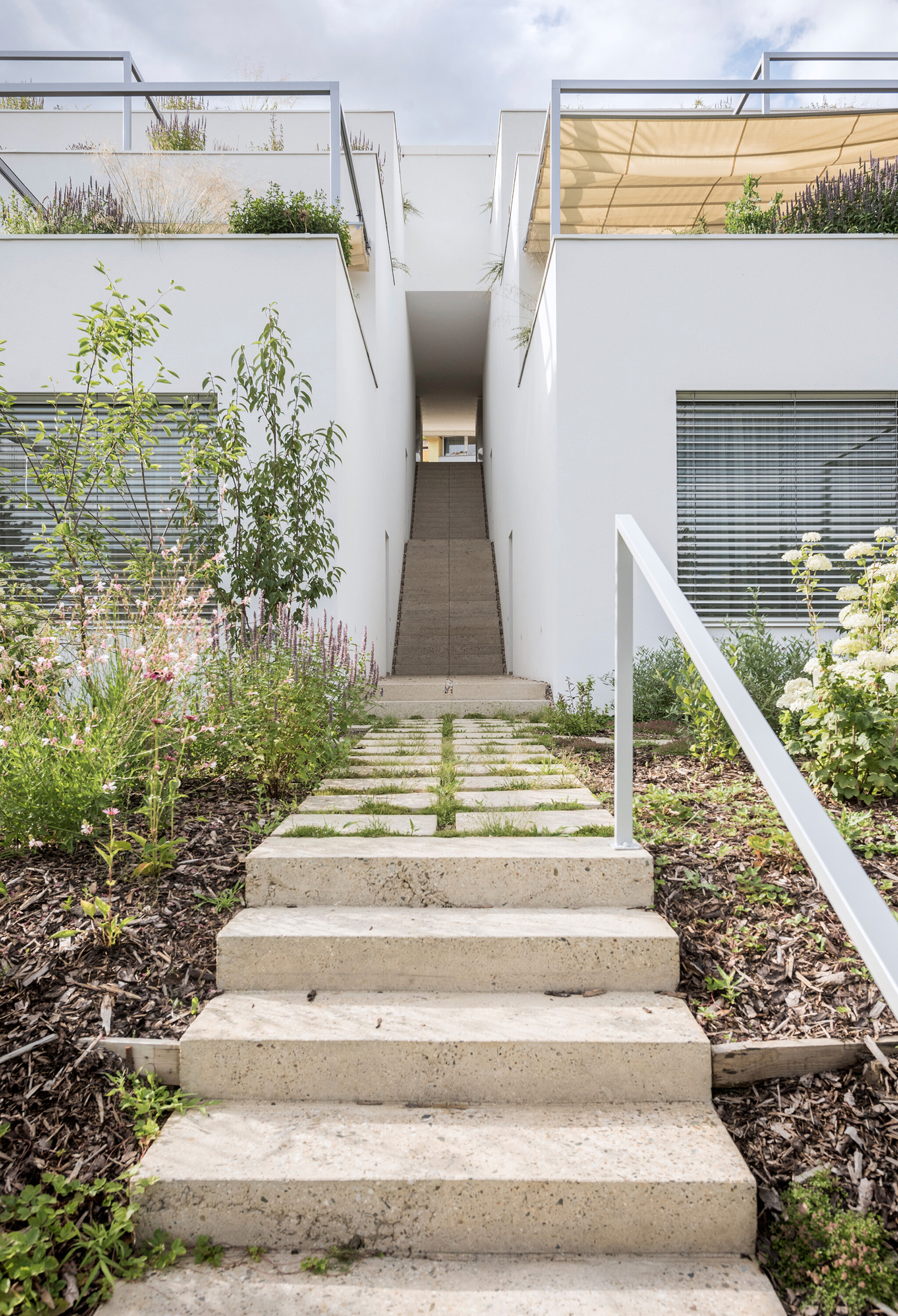 The house thus has two faces – one to the city and one to the greenery. Our goal was to design homes surrounded by greenery on all floors of the building. Shaded terraces with built-in planters and essentially unobstructed views of the horizon or the green garden from the living rooms are the main motifs. With its simple materials and restrained colours, the building does not compete with the greenery.